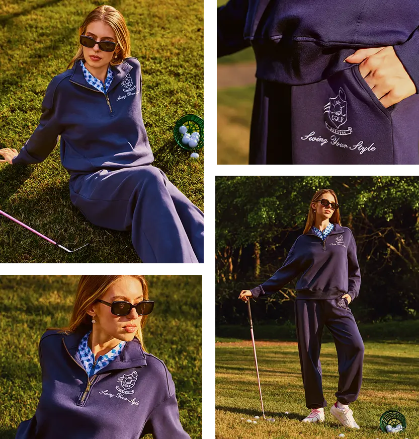 Take an evening stroll on the lawn or under tree shadows in the Royal Ease Quarter-Zip Sweatshirt Set. The top’s flexible quarter-zip collar can be worn up or folded down, accented with subtle embroidery for a refined touch. The soft, stretchable fabric ensures comfort, while the relaxed fit allows for easy layering. Matching jogger-style pants with snug ankle cuffs complete this look, making it a perfect choice for casual fall outfits that move seamlessly with your day—from sunset walks to outdoor gatherings.