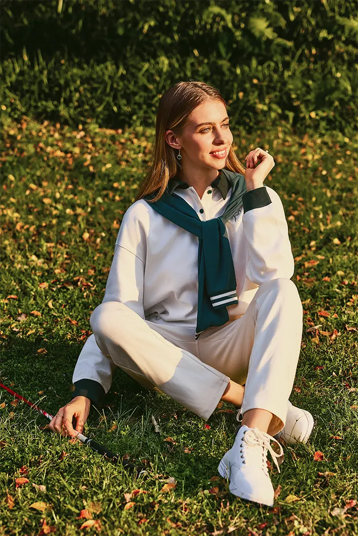 Start your day amidst morning pine trees in the Alpine Dawn Sweatshirt, where crisp white meets forest green contrast. The buttoned collar and fitted silhouette provide comfort and warmth. Pairing with white golf pants would be a smart choice. Soft and breathable, this sweatshirt is ideal for cozy fall layering or versatile fall outfits, whether you’re enjoying a quiet morning walk, practicing on the course, or sipping coffee at a scenic overlook.
