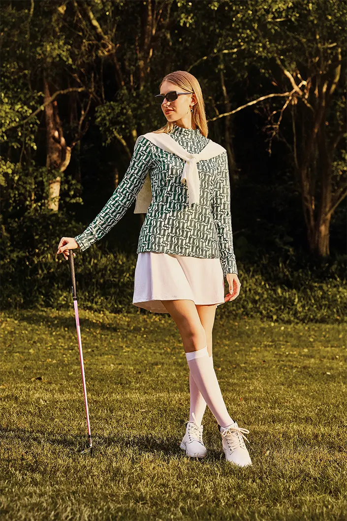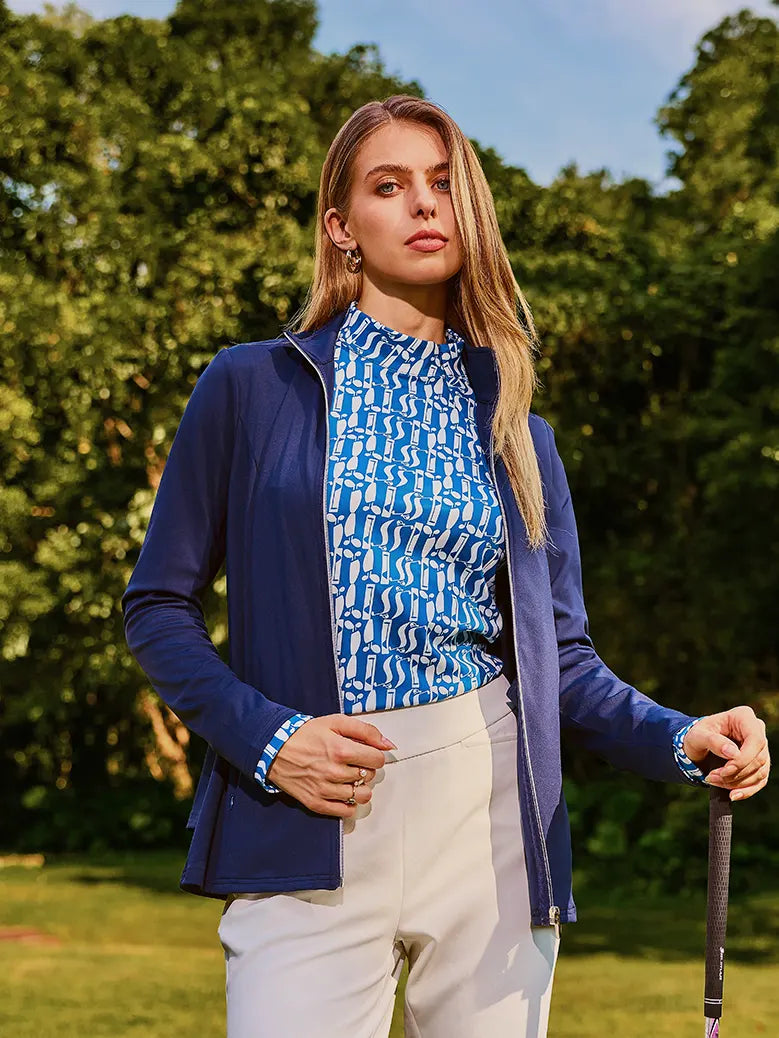 Step onto the fairway or stroll through an autumn park in the Evergreen Swing Side-Zip Polo. Its subtle golf-inspired print paired with crisp white bottoms radiates effortless elegance, while the angled side-zip lets you adjust for cooler fall mornings. Made from breathable, 4-way stretch fabric, this polo moves with you, swing after swing, or from the course to a casual lunch. Available in deep green and classic navy, it’s the perfect addition to your fall golf outfits.