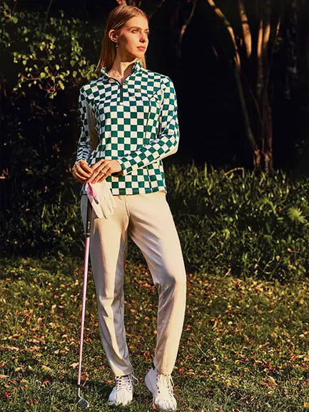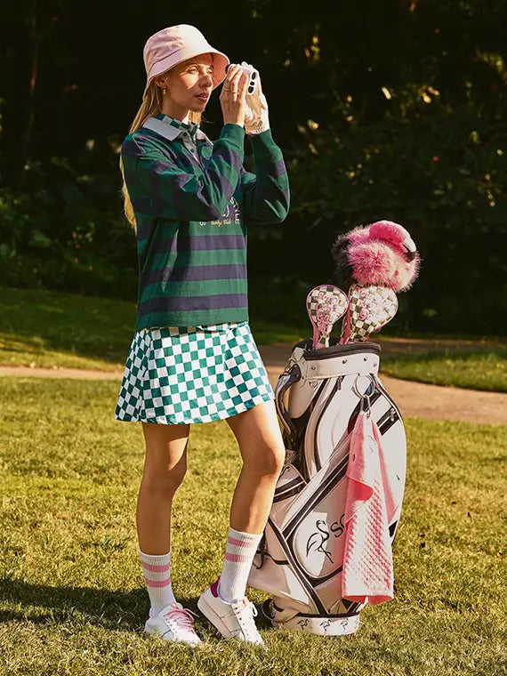 Bring a touch of Golden Time countryside elegance to your fall wardrobe with the Heritage Charm Pleated Dress. The diamond-check detail and flowing pleated skirt catch the breeze with every step. Lightweight and refined, it’s a dress that transitions effortlessly from swing to fall evenings, making it an essential piece of women’s golf apparel that balances charm with movement.