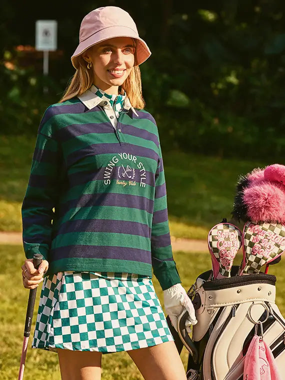 Crafted from soft cotton, the embroidered front detail adds a subtle touch of sophistication, while the blue-and-green stripes bring energy to your outfit. Pair it with a skort or pleated skirt for a look that’s versatile for fall fashion, moving seamlessly from your morning round of golf to casual gatherings.