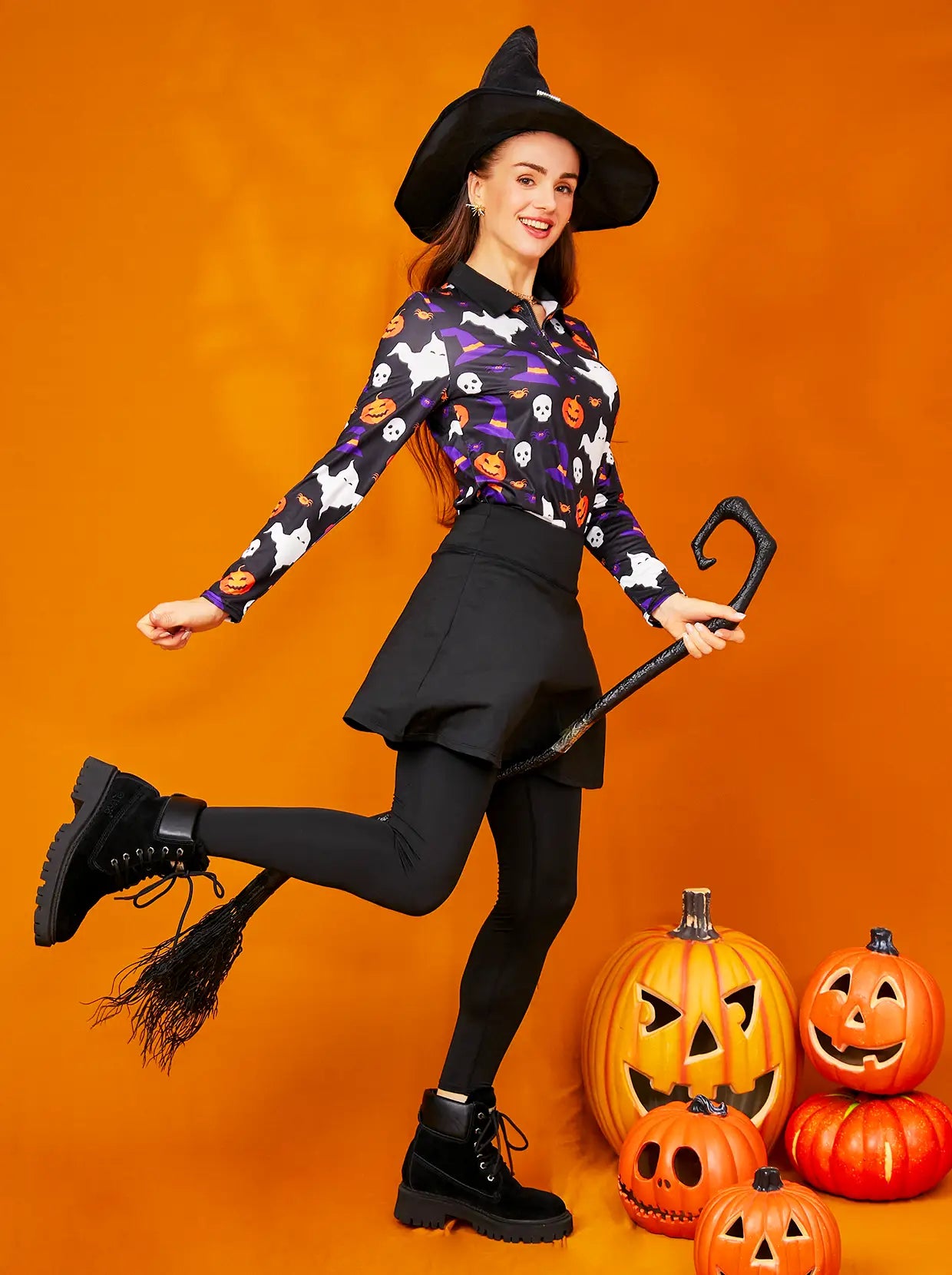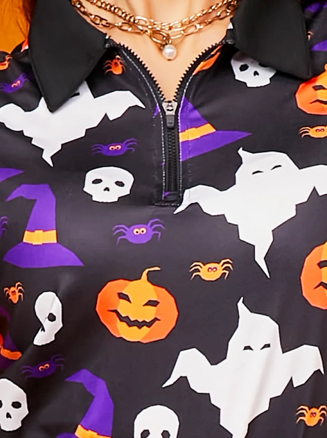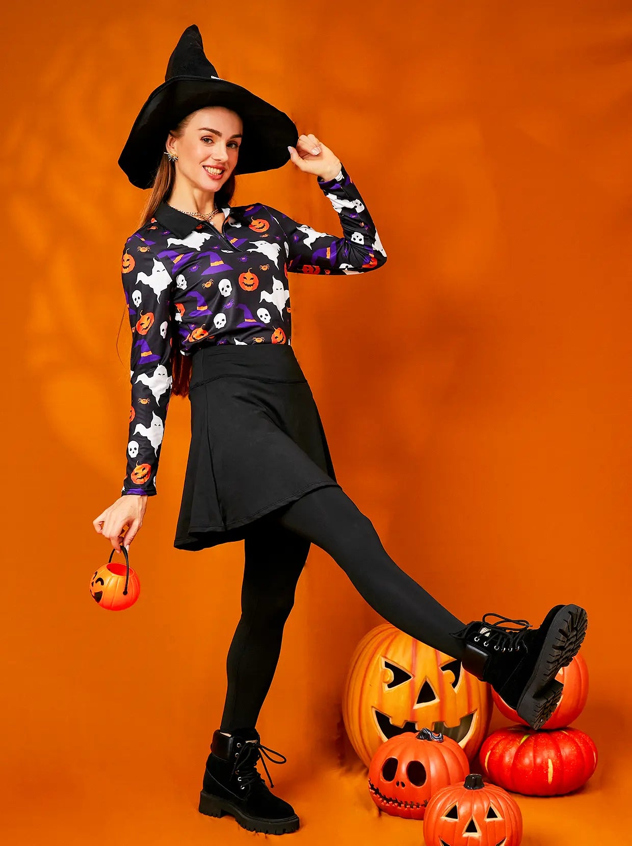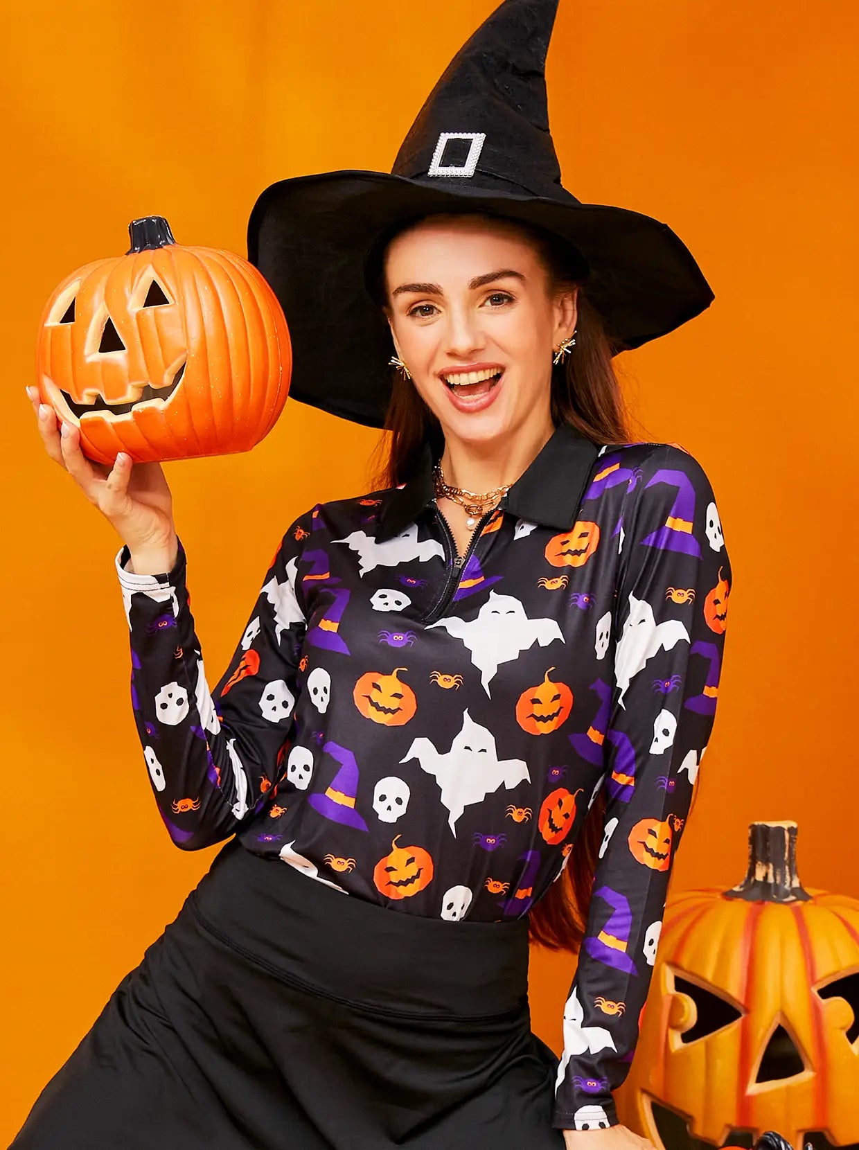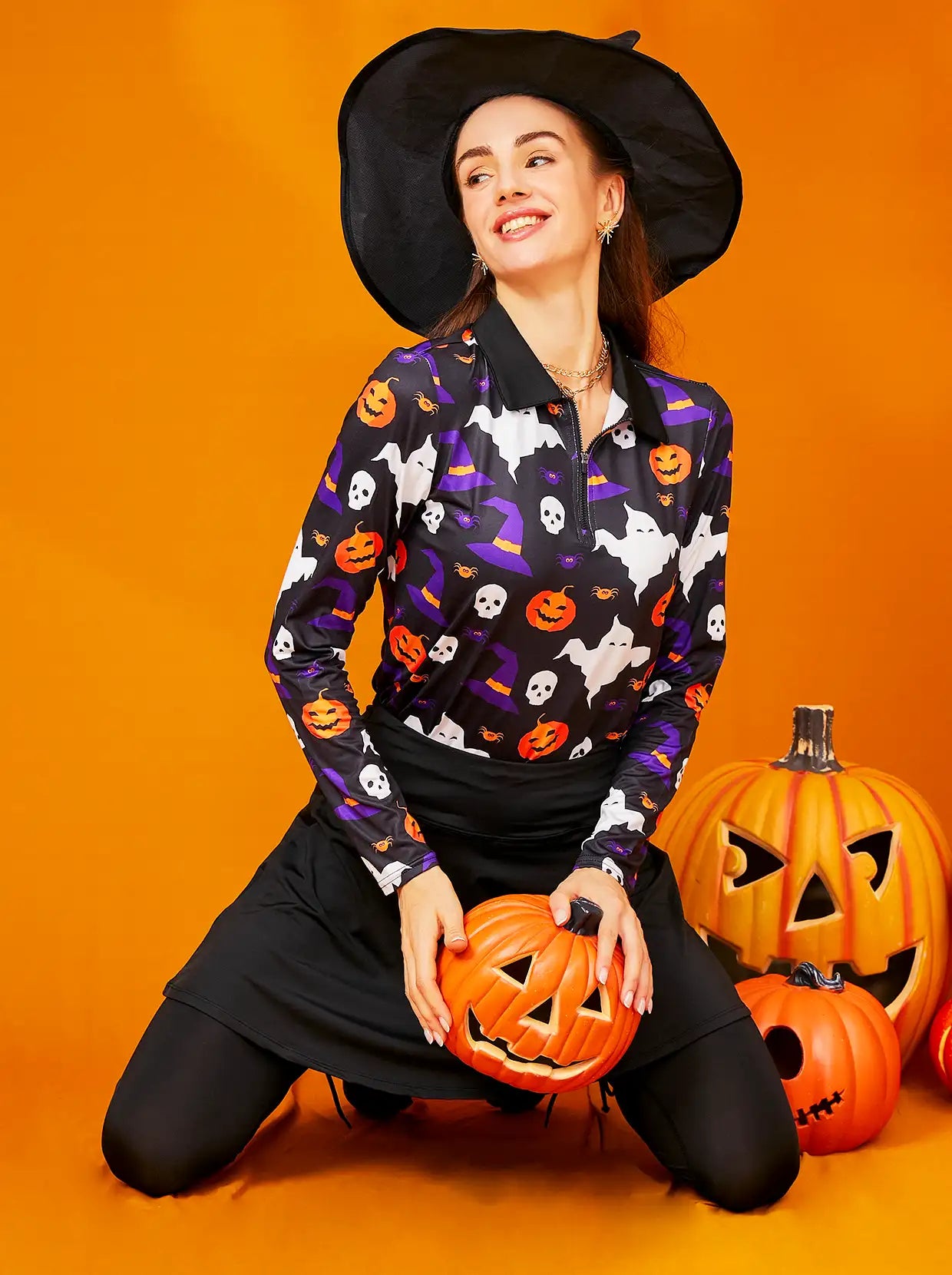 Bring Halloween charm to your game with this coordinated black long-sleeve top and matching pumpkin-print skirt. Soft, flexible fabric keeps you comfortable while playful jack-o’-lantern smiles add a festive, eye-catching touch—perfect for the course or a party.
