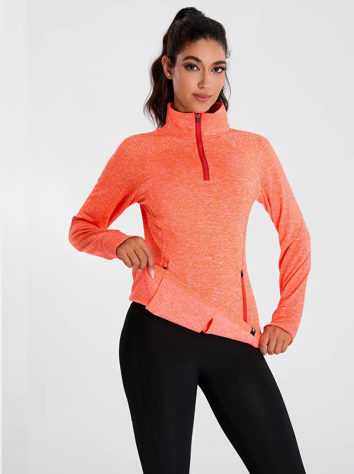 Keep warm and active during your runs with our women's quarter-zip fleece top. Designed for active lifestyles, this top features a soft, fleece lining, quick-dry fabric, and 4-way stretch for maximum comfort and mobility. With side zippered pockets to keep your essentials secure, thumb holes for added warmth and protection, you'll be ready to tackle any weather.