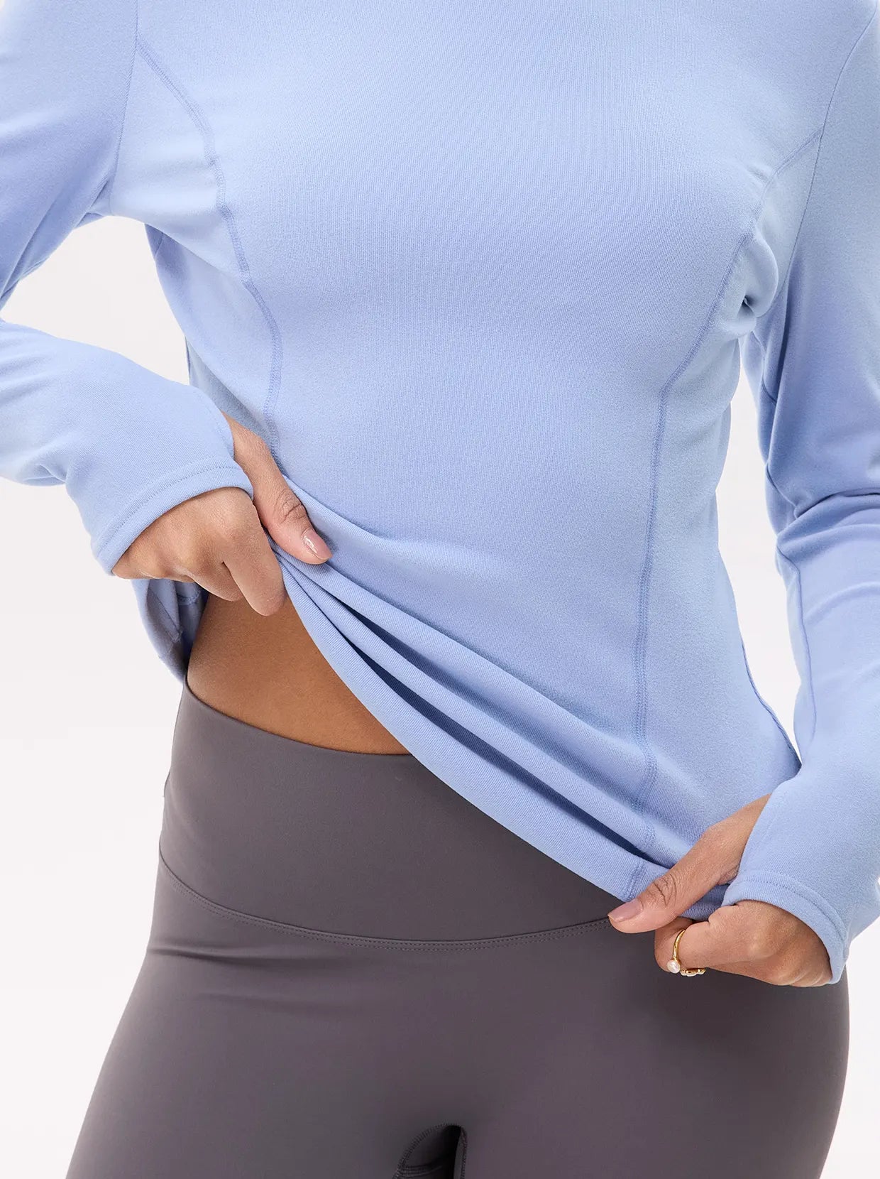 Get cozy in this solid long-sleeve thermal top. This navy long-sleeve thermal top, featuring a cozy cowl neck, is perfect for keeping warm on your adventures. Featuring thumb holes for added comfort, a windproof mask to block the breeze, and a curved hem for a flattering fit, it’s soft, stretchy, and great for layering or rocking on its own. Ideal for hiking or just everyday fun!