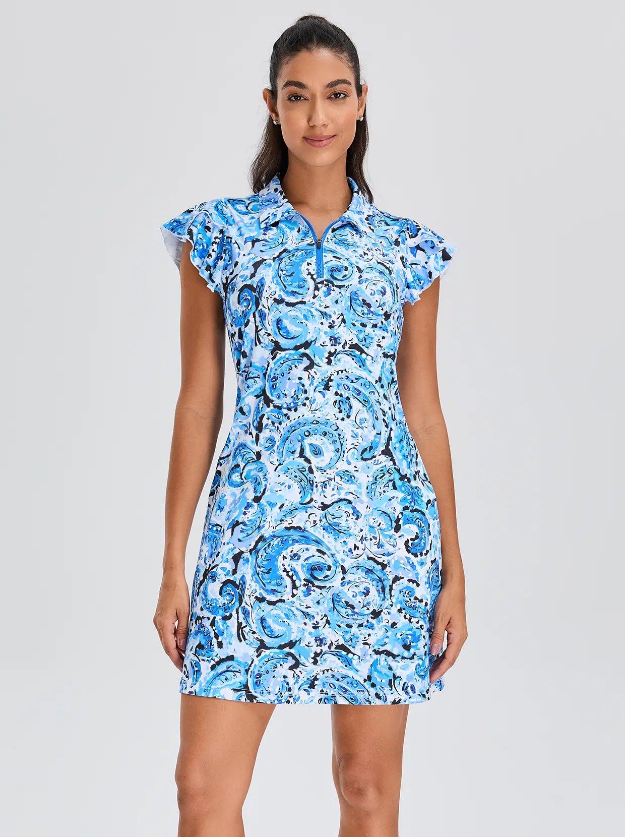 Blue Paisley 34" Quarter-zip Ruffled Short Sleeve Dress with Shorts