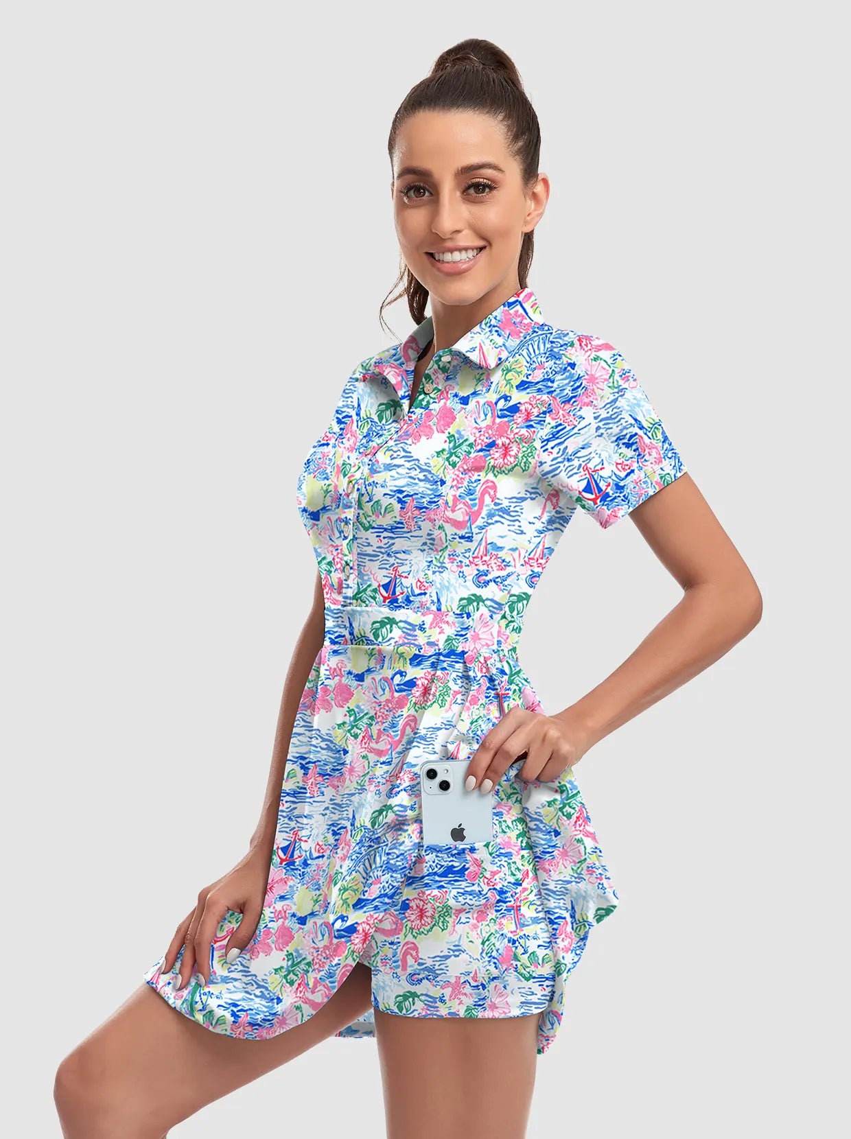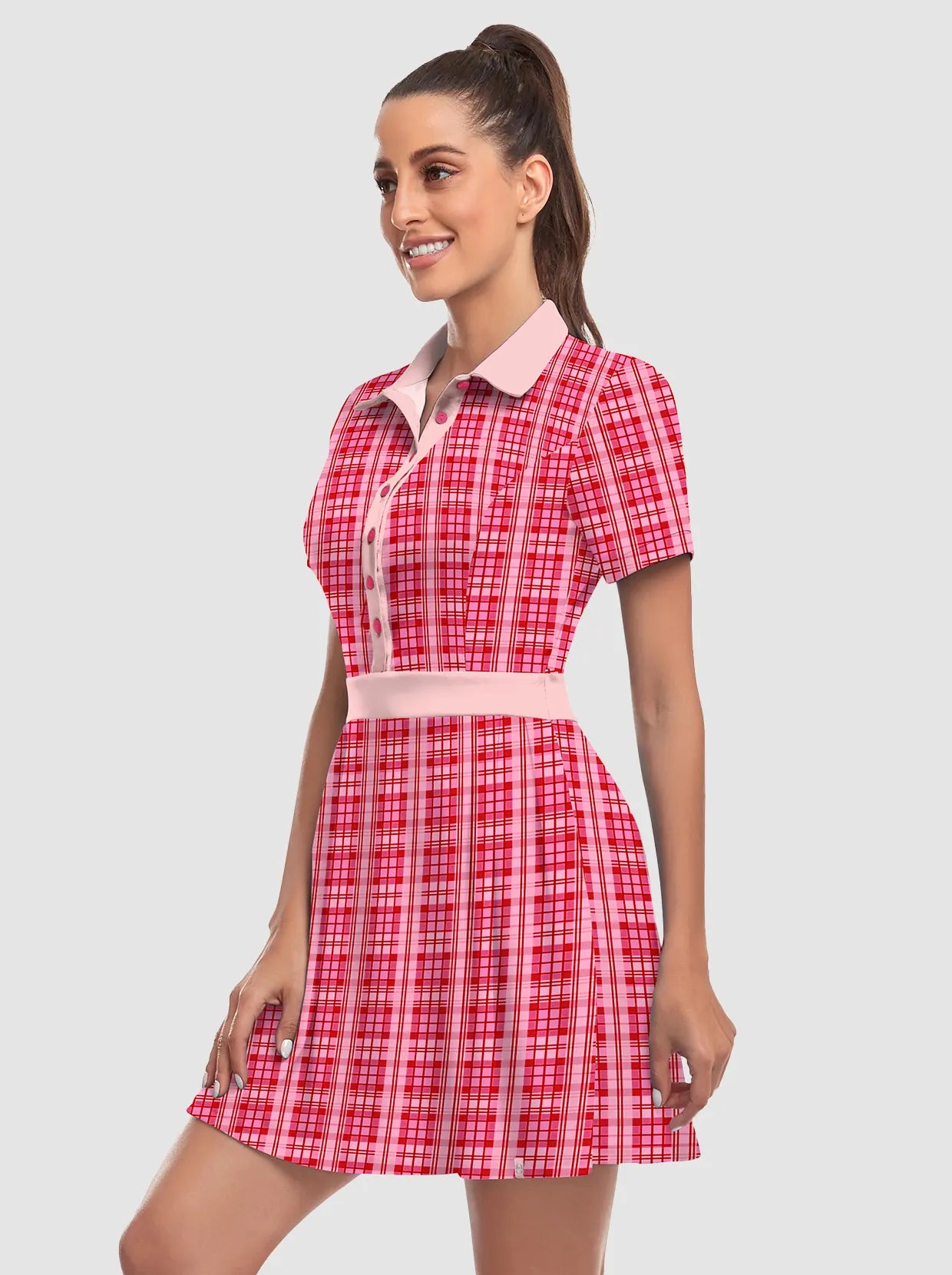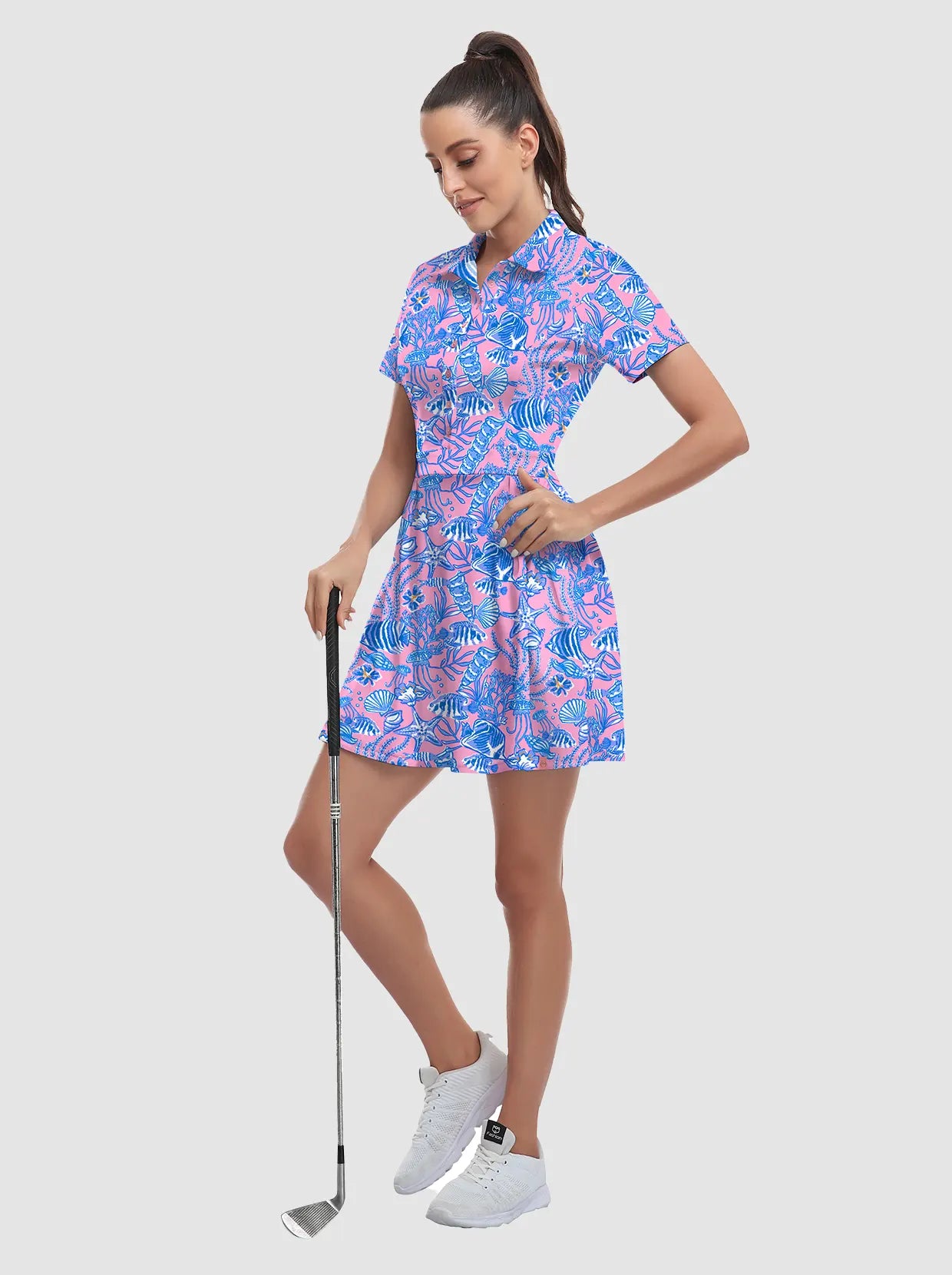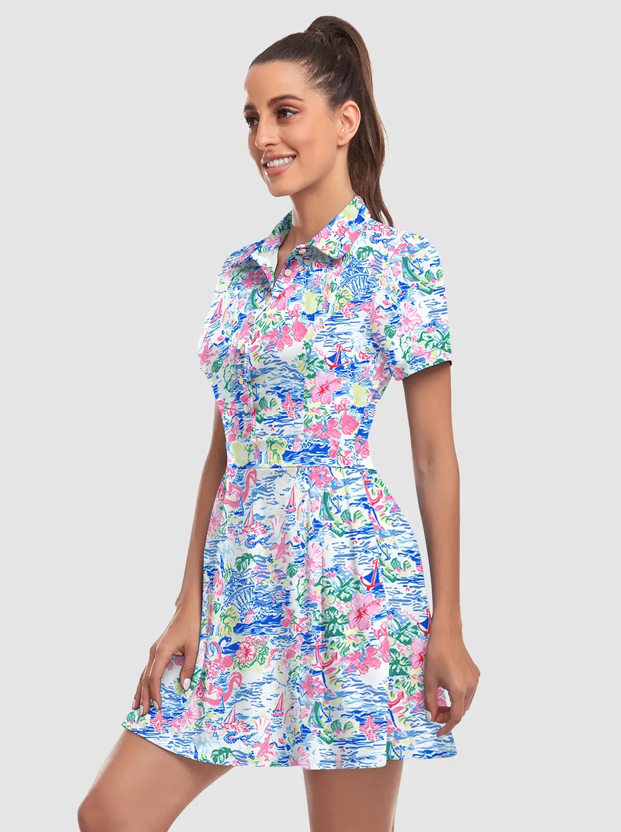 Your dream to glide across the course like a graceful flamingo is about to come true! Our short-sleeved tennis/golf dress is designed to enhance your feminine curves while ensuring maximum comfort and style. With 4-way stretch and anti-wrinkle fabric, you'll be serving looks and aces effortlessly. It's the perfect time to unleash your inner athlete!