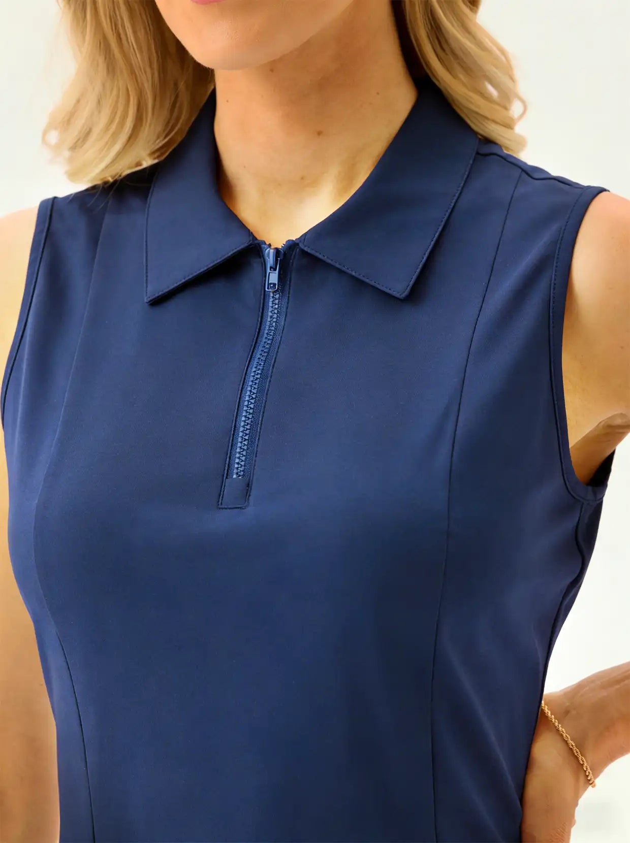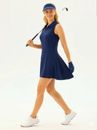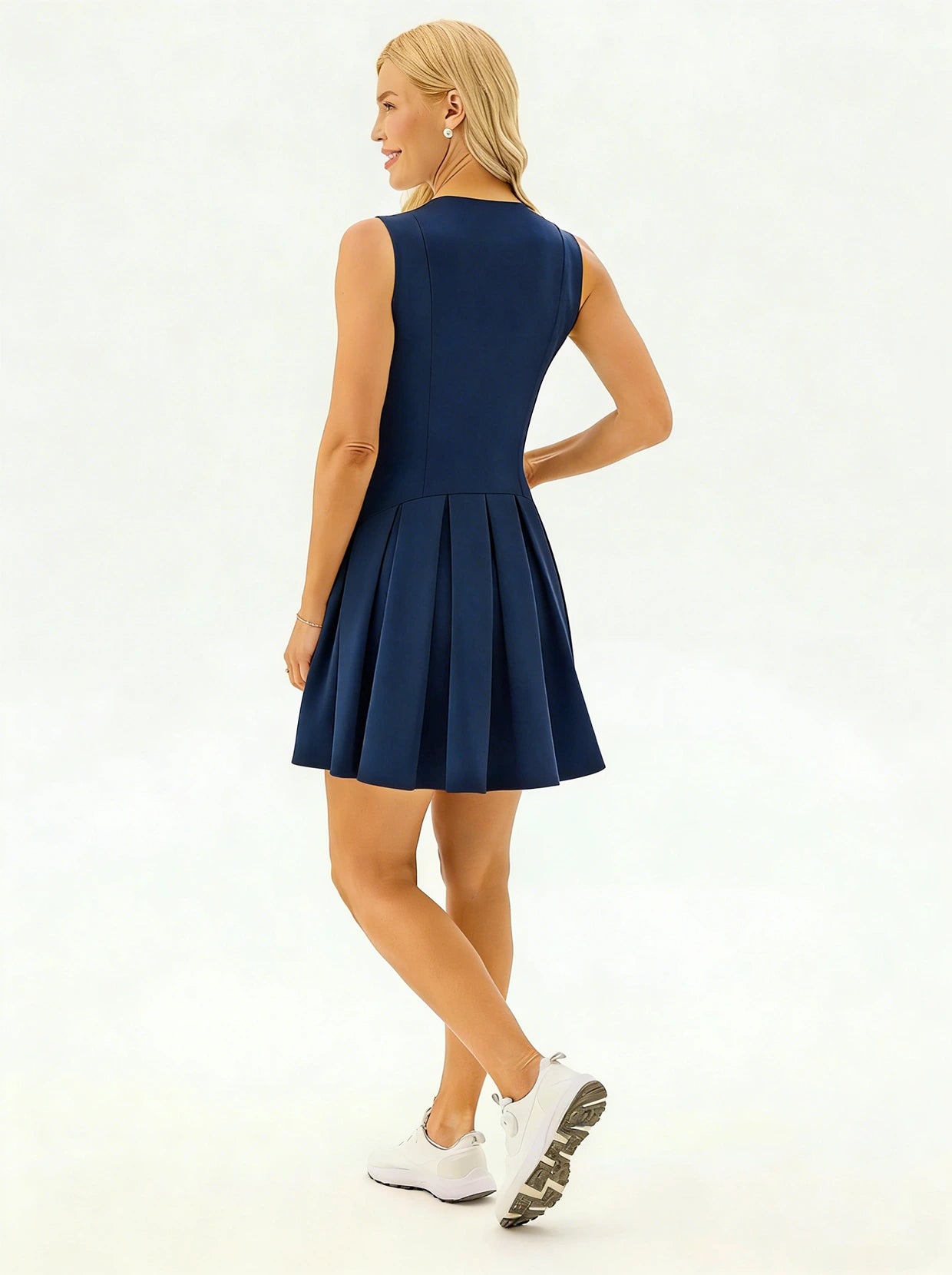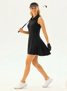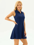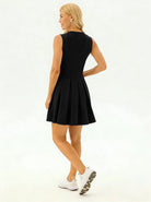 Move freely and stay cool in this versatile quarter-zip sleeveless dress. This sleeveless dress features a quarter-zip collar and a stylish hem with back pleats for added mobility. It comes complete with inner shorts and pockets for functional coverage and storage. Available in classic navy and black, it’s the perfect high-performance staple for golf, tennis, or daily wear.