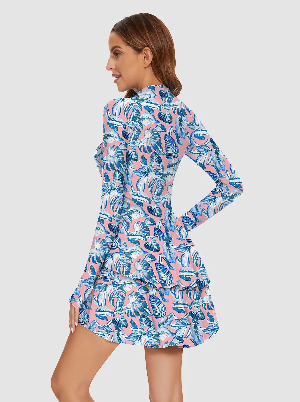 Blue Leaves Quarter-zip Rash Guard With Built-In Bra
