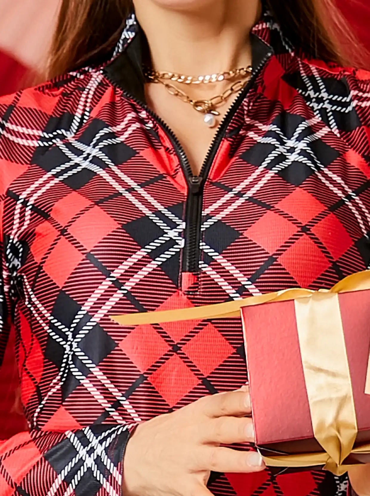 Christmas Red Argyle Quarter-zip Long-sleeve Shirt for Women