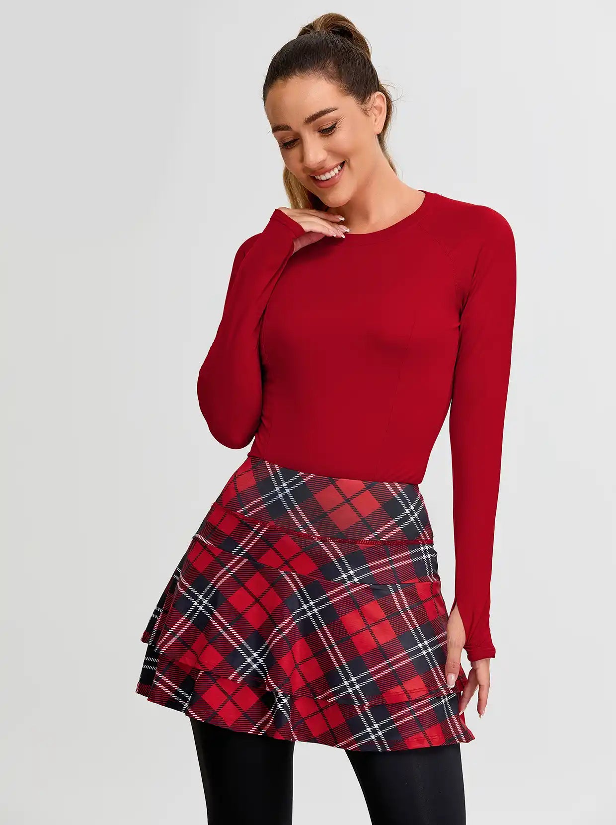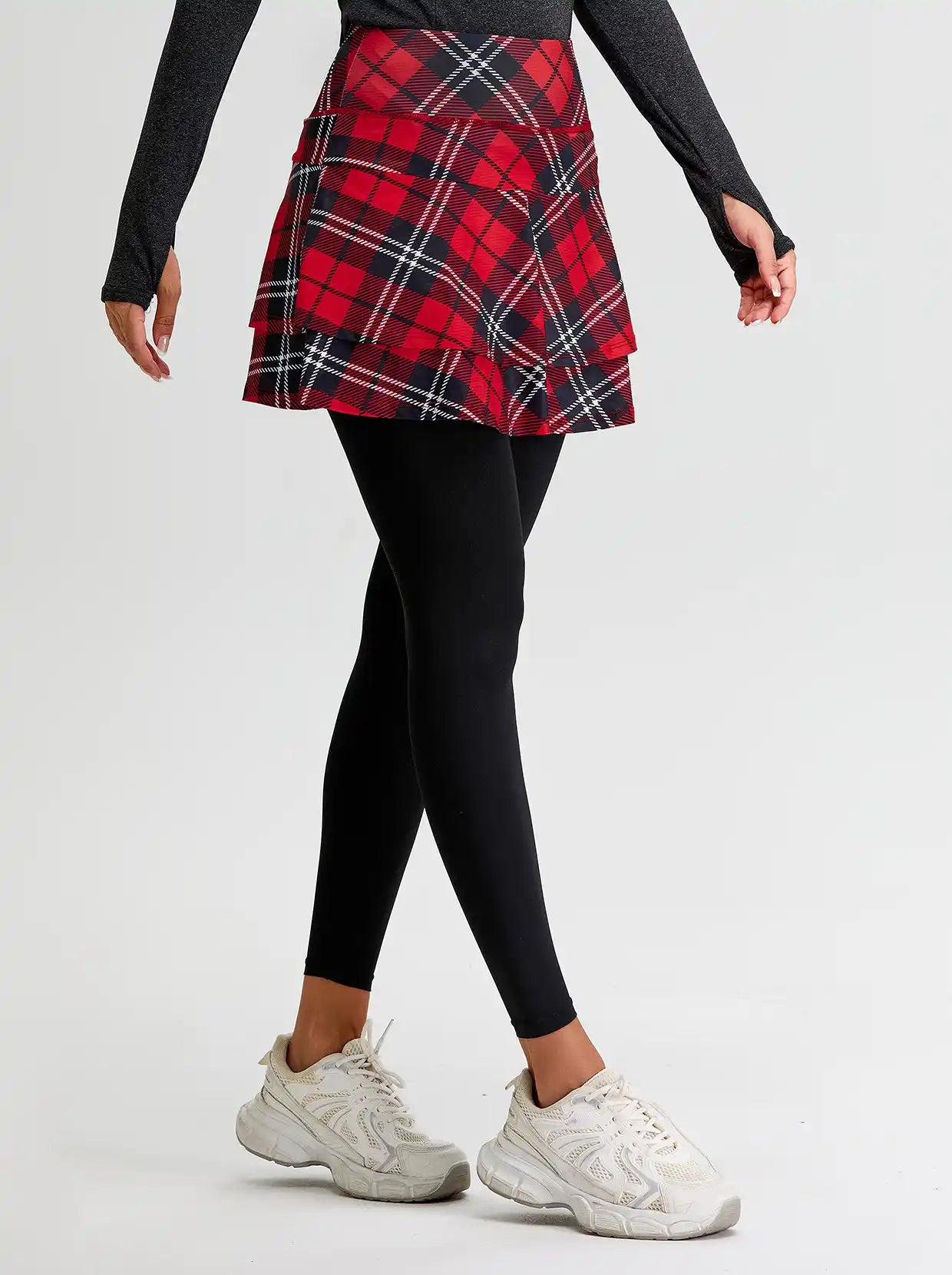 Spread holiday cheer with our festive pleated Athletic Skirted Leggings. Featuring soft and stretchy fabric, our athletic skirt leggings offer superior comfort. The double layer provides coverage and flair, while the side pockets keep your essentials within reach. The wide, flat waistband ensures a secure and comfortable fit. The festive red checkerboard pattern adds a touch of holiday cheer, making it perfect for Christmas parties with friends.