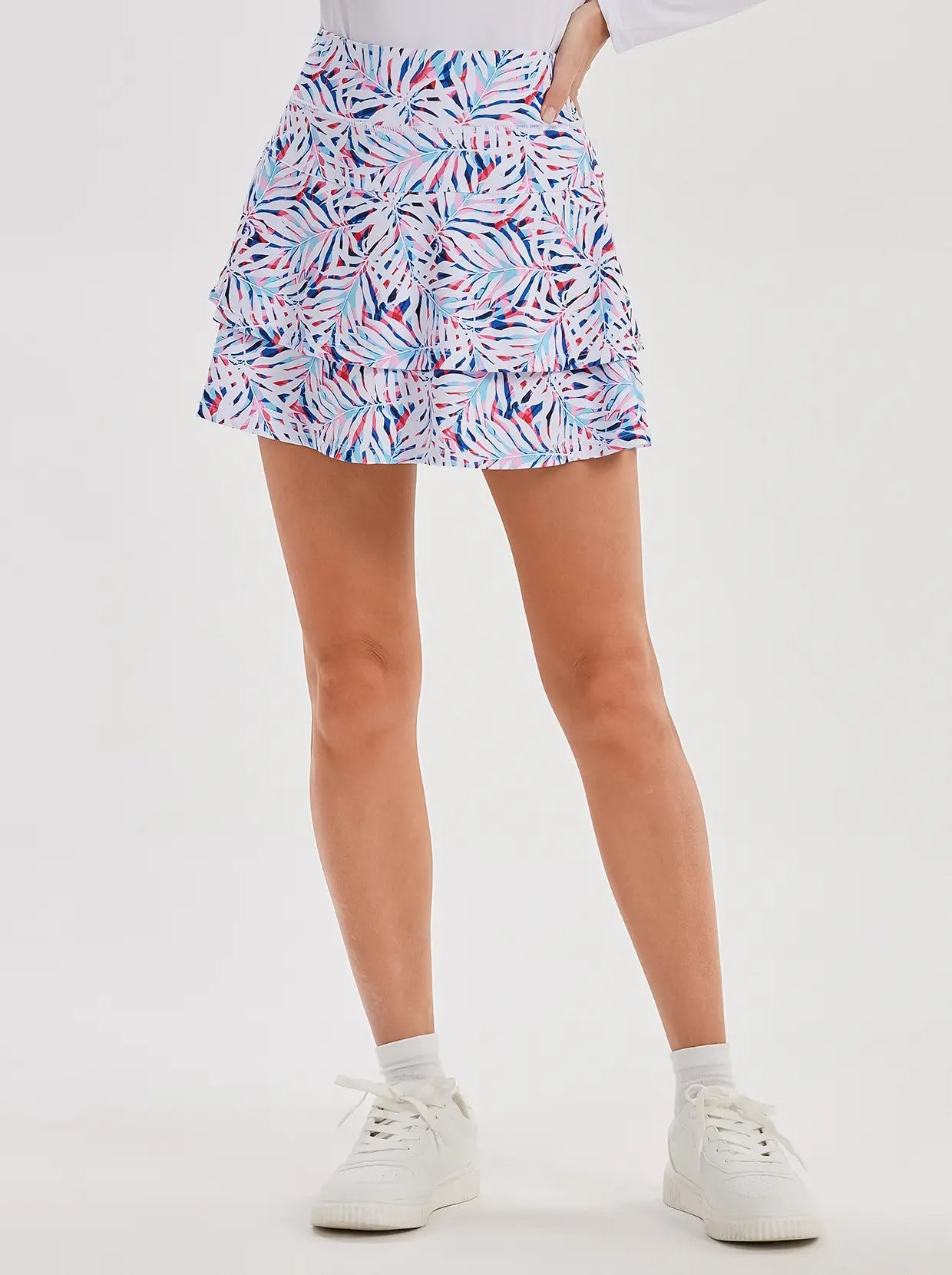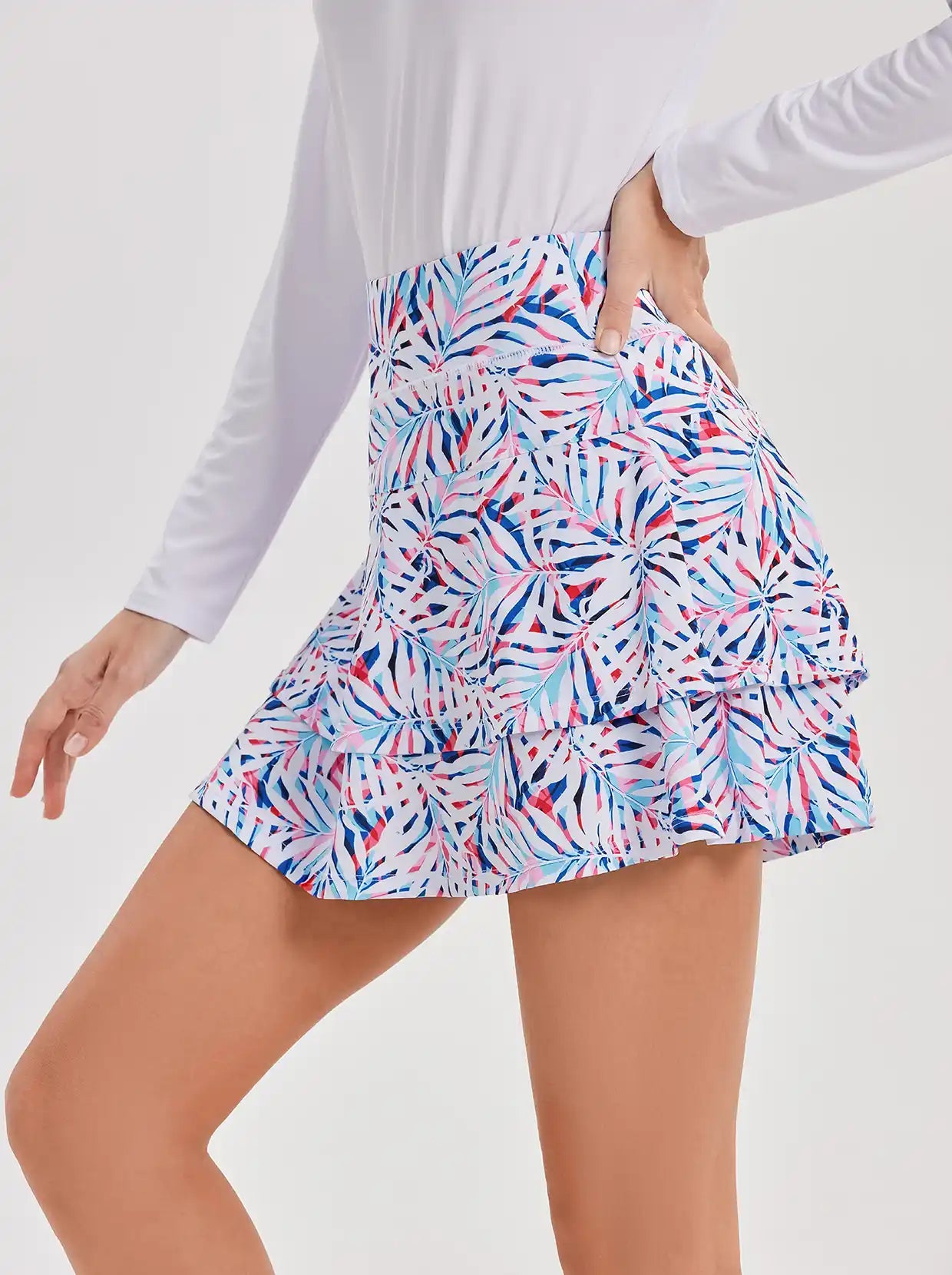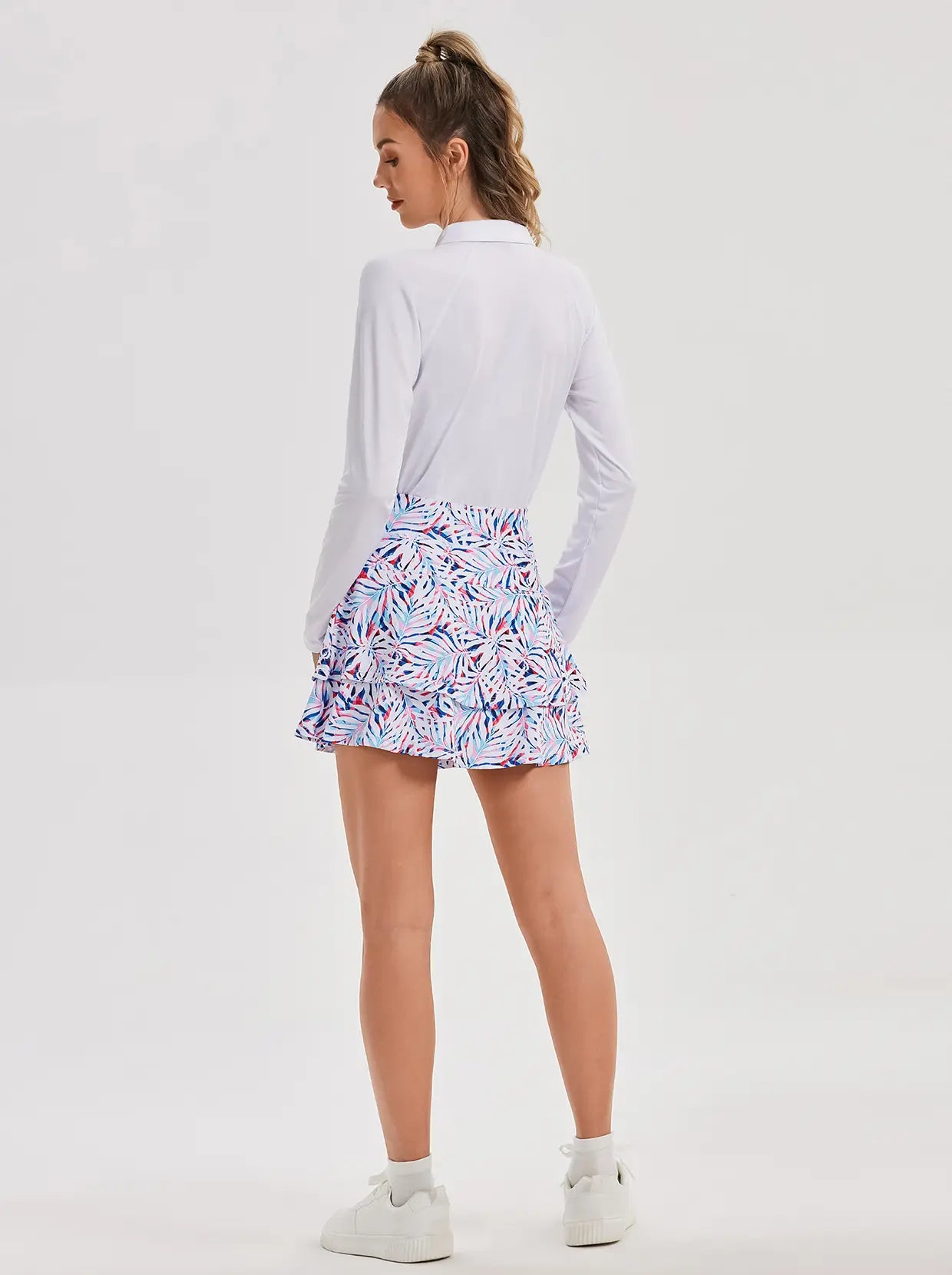 Embrace the outdoors in style and comfort with our colorful leaves ruffle pleated tennis skort. This skort combines fashion and function, perfect for hiking, picnics, or casual adventures. Crafted from soft, quick-drying, and breathable fabric, it keeps you cool and dry. Double ruffles lend a playful charm, while built-in shorts offer added security and comfort. The flat-wide waistband ensures maximum comfort, and a convenient side pocket keeps your essentials close at hand.