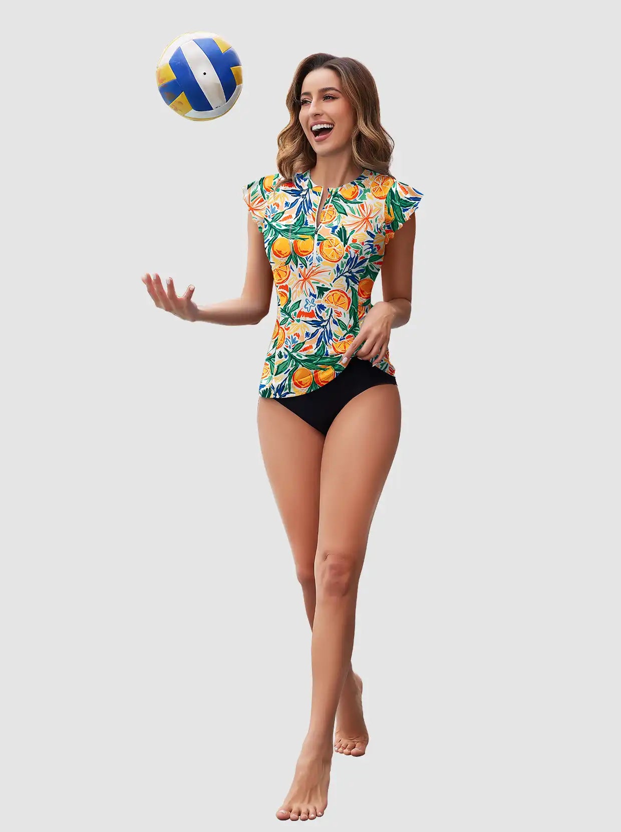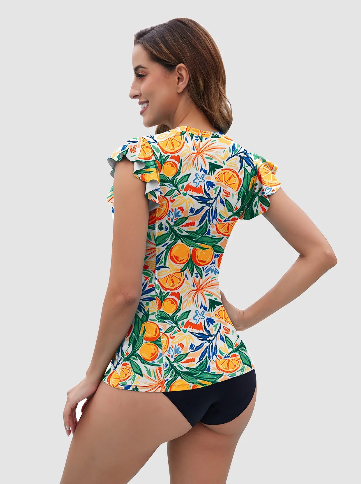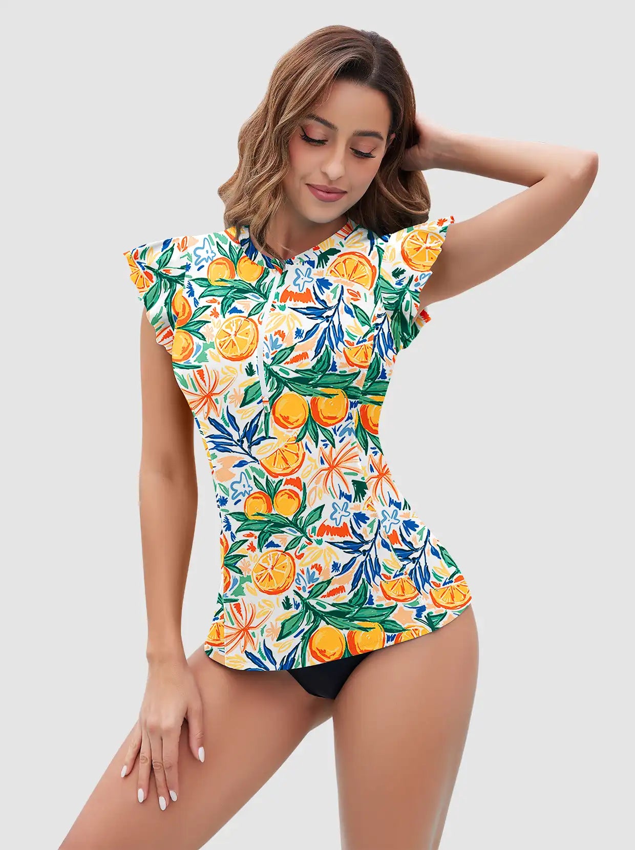 Get the most out of your beach activities with this rash guard! The stretch fabric and sleeveless design make it easy to move around, while the ruffle sleeves add a fun touch. Don't worry about discomfort, as the built-in bra and breathable, 4-way stretch material allow for easy movement and quick drying. With the vibrant multicolor fruit pattern, you'll stand out from the crowd, making it perfect for surfing, beach volleyball, and any summer outing. Don't let anything hold you back - take a risk and embrace the adventure with this rash guard!