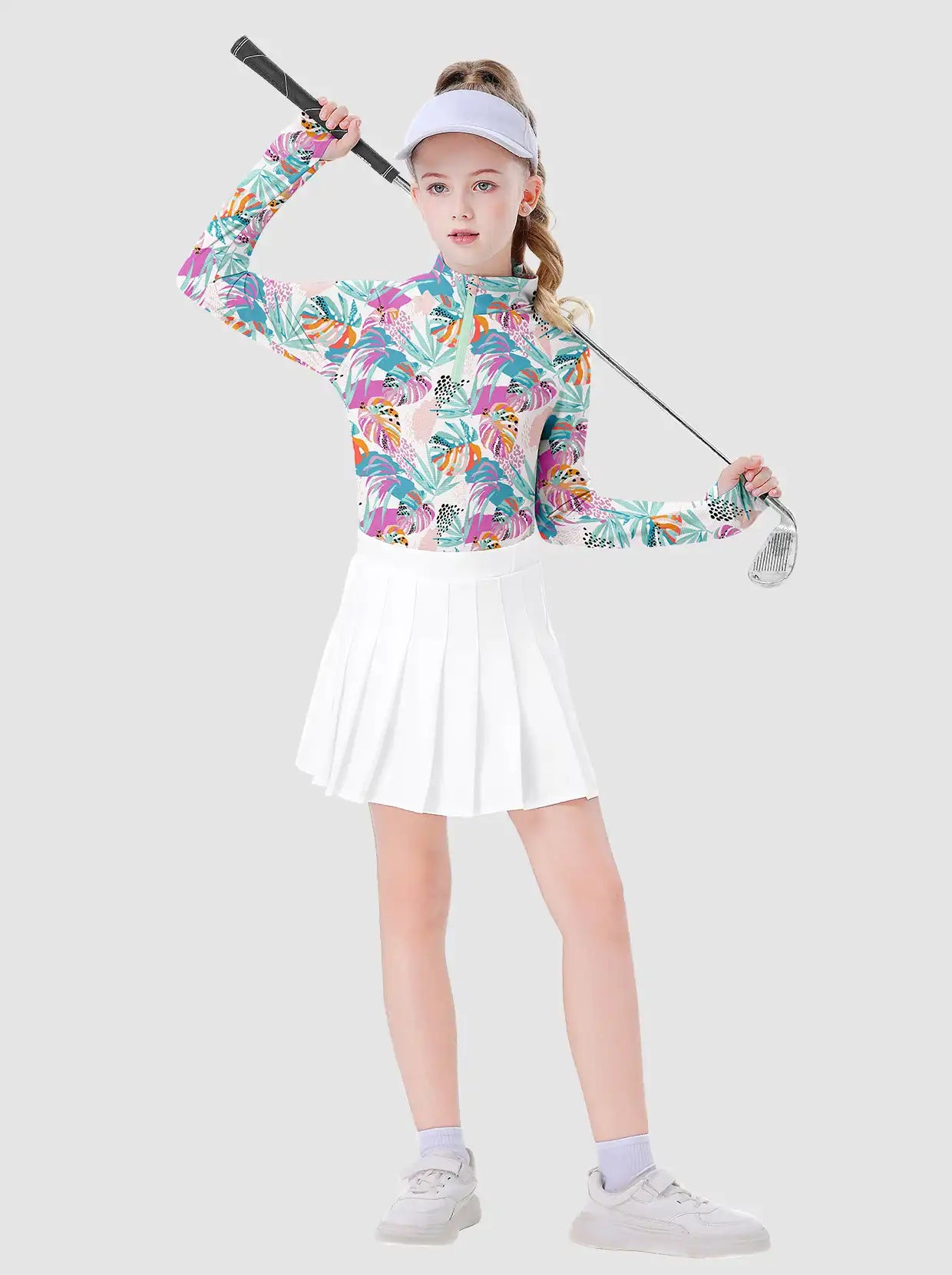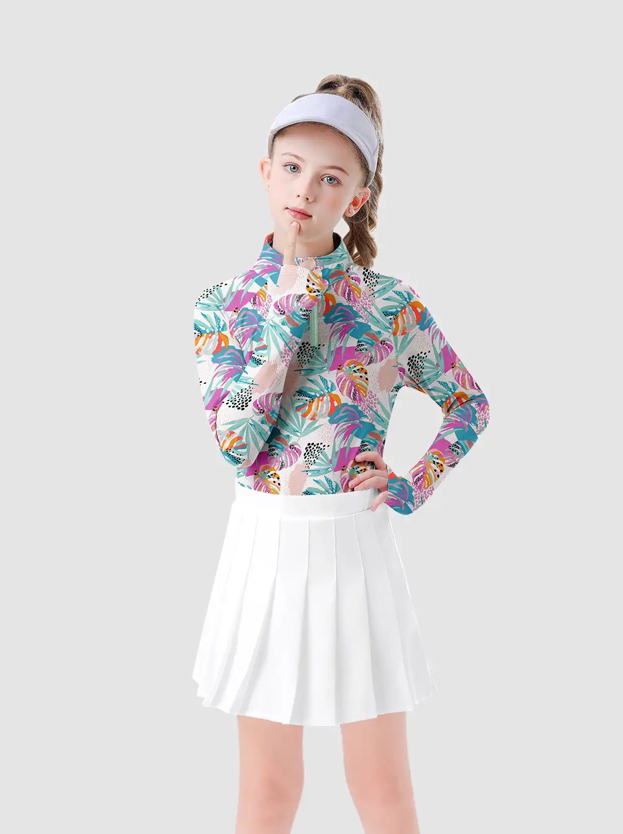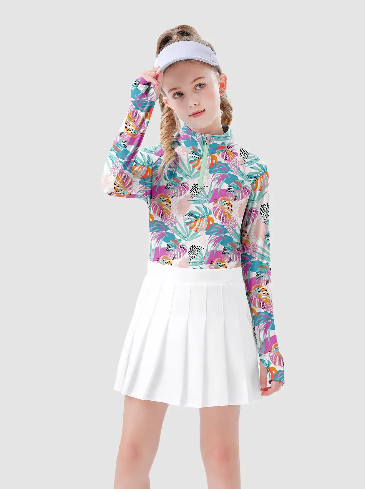 Perfect for girls aged 6-14, our colorful leaf print long-sleeve shirt offers both style and functionality. Keep your little one comfortable and dry on all her adventures with its moisture-wicking and quick-drying properties. Featuring thumb holes and a raglan sleeve design, this shirt provides an active fit and 4-way stretch for ultimate mobility. With a convenient quarter-zip, this shirt is perfect for outdoor activities and daily wear. Get your hands on this must-have for your growing girl's wardrobe today!