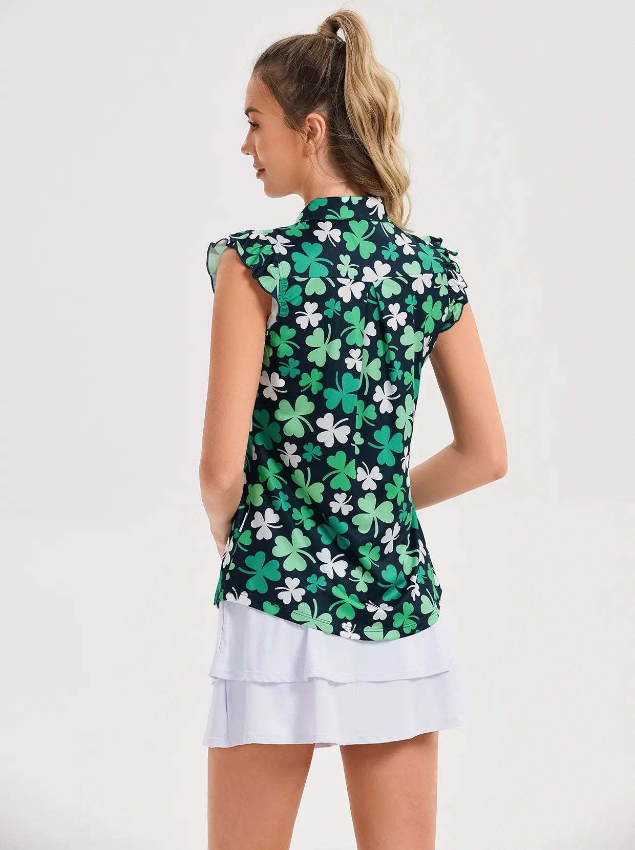 Green Shamrock Ruffled Sleeveless Polo Shirt For Women