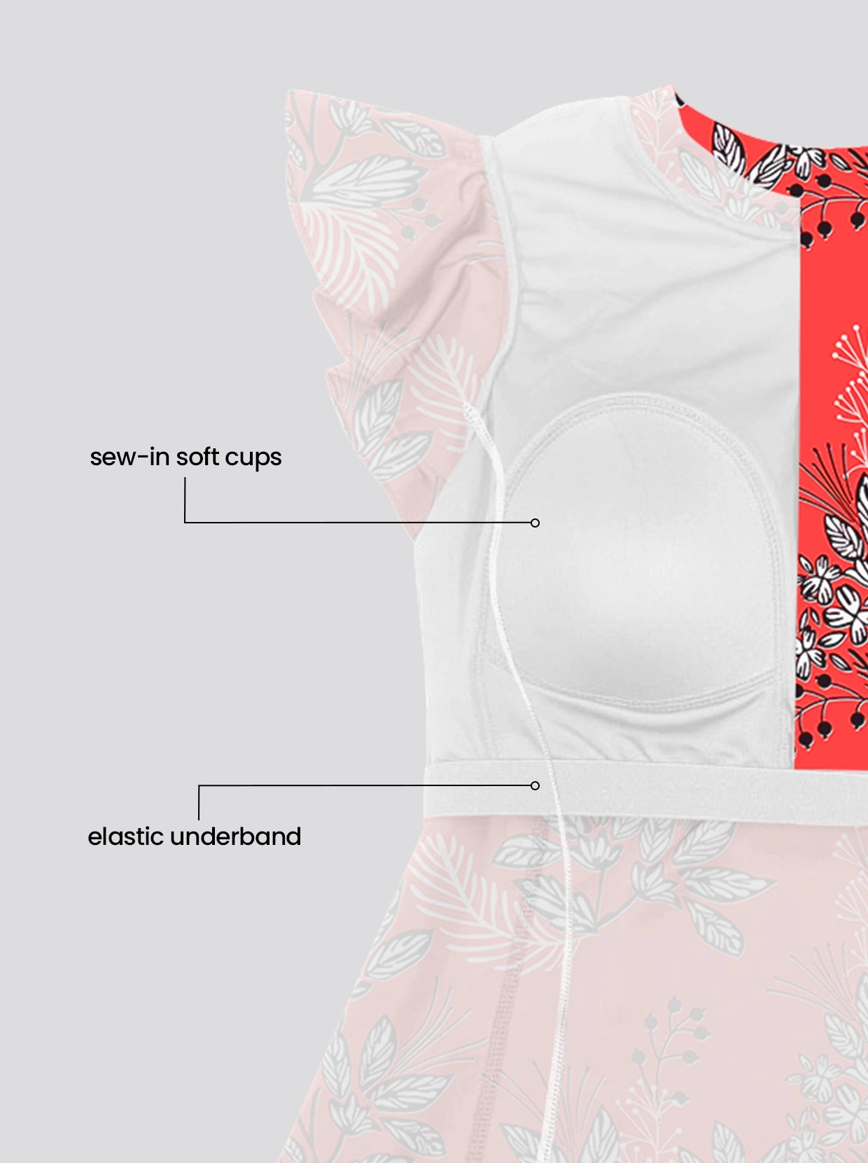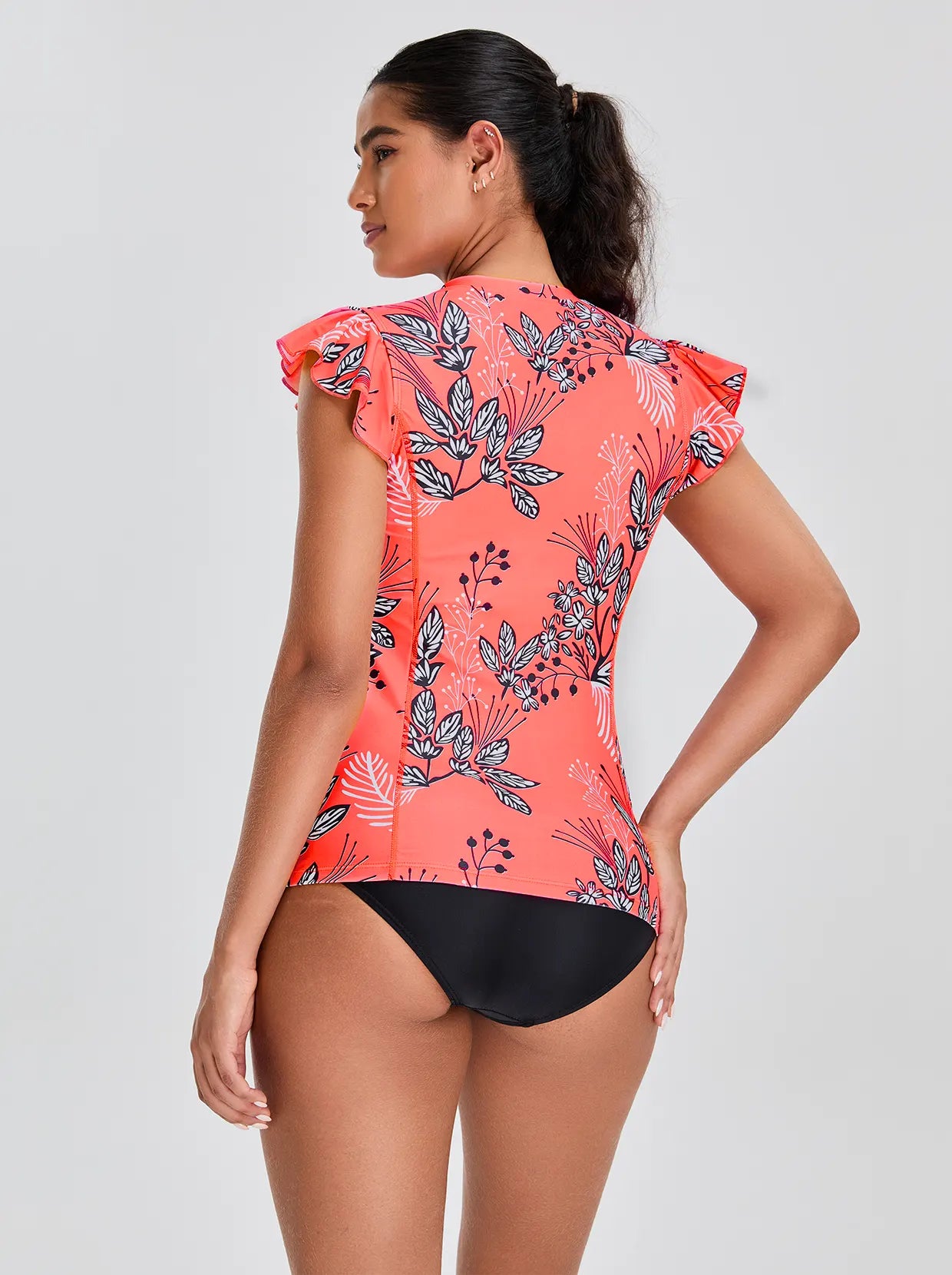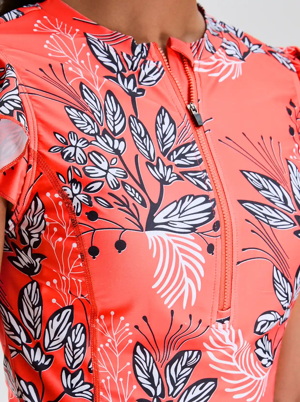 Orange Leaves Quartetzip Ruffled Sleeveless Rash Guard For Women