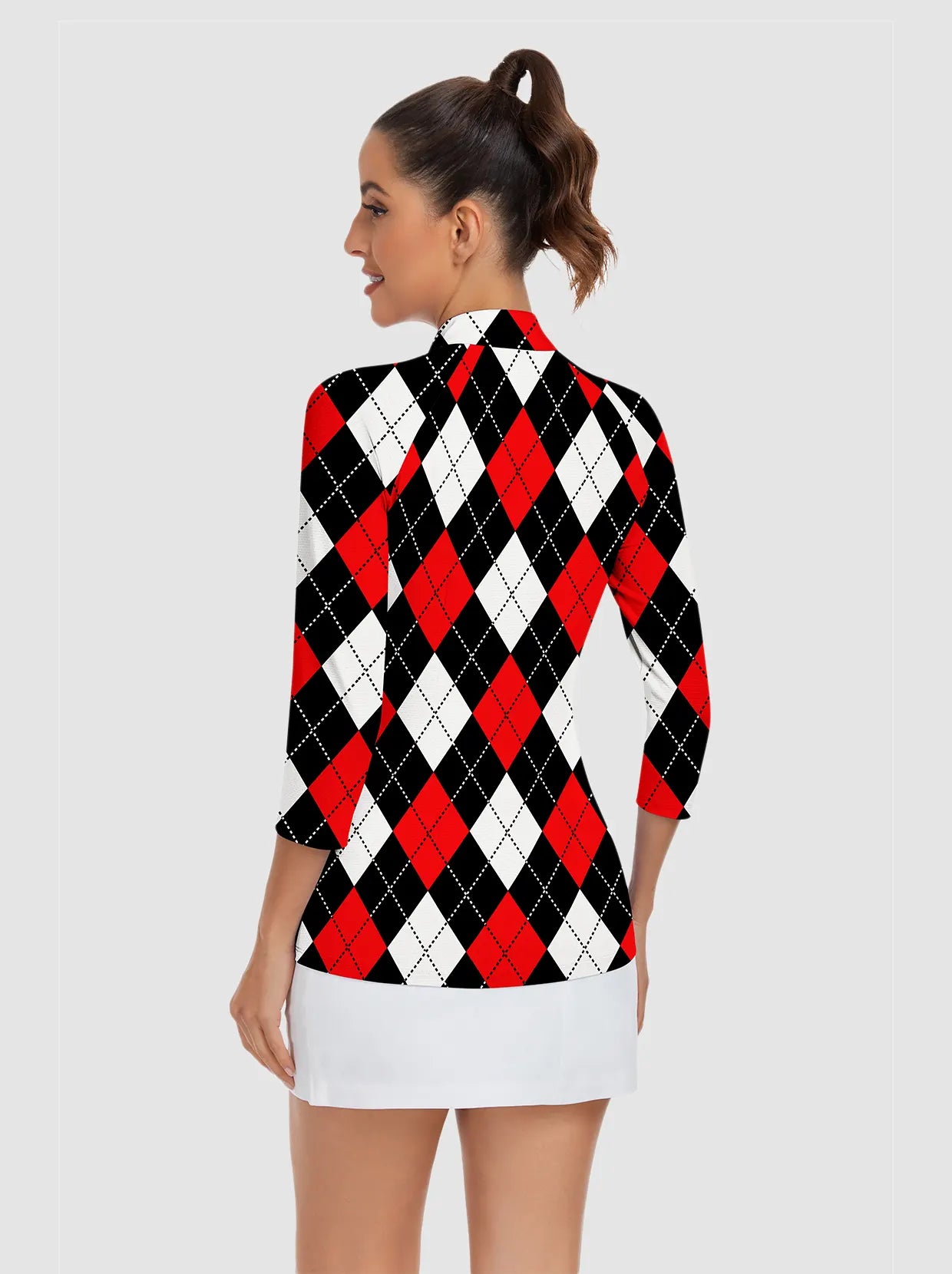 Red and Black Checkerboard Quarter-zip 3/4 Sleeve Golf Shirt For Women