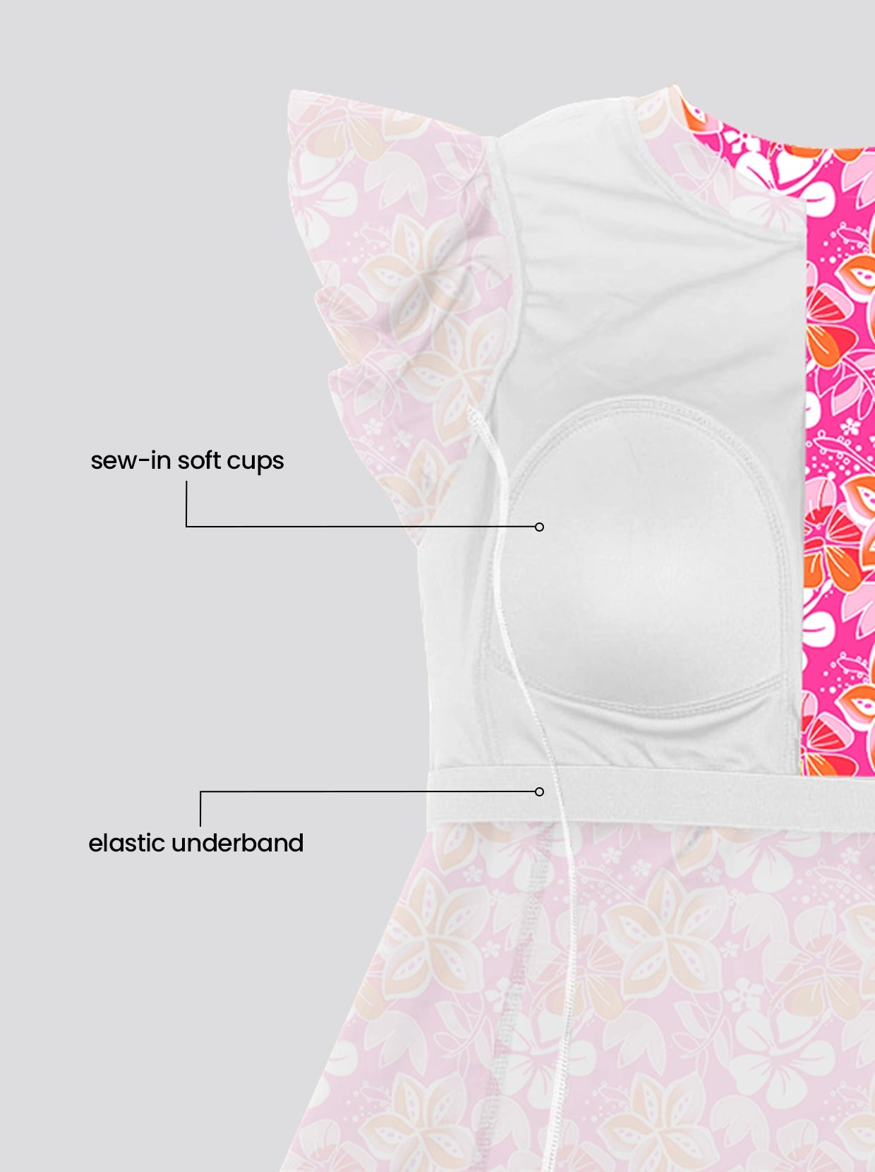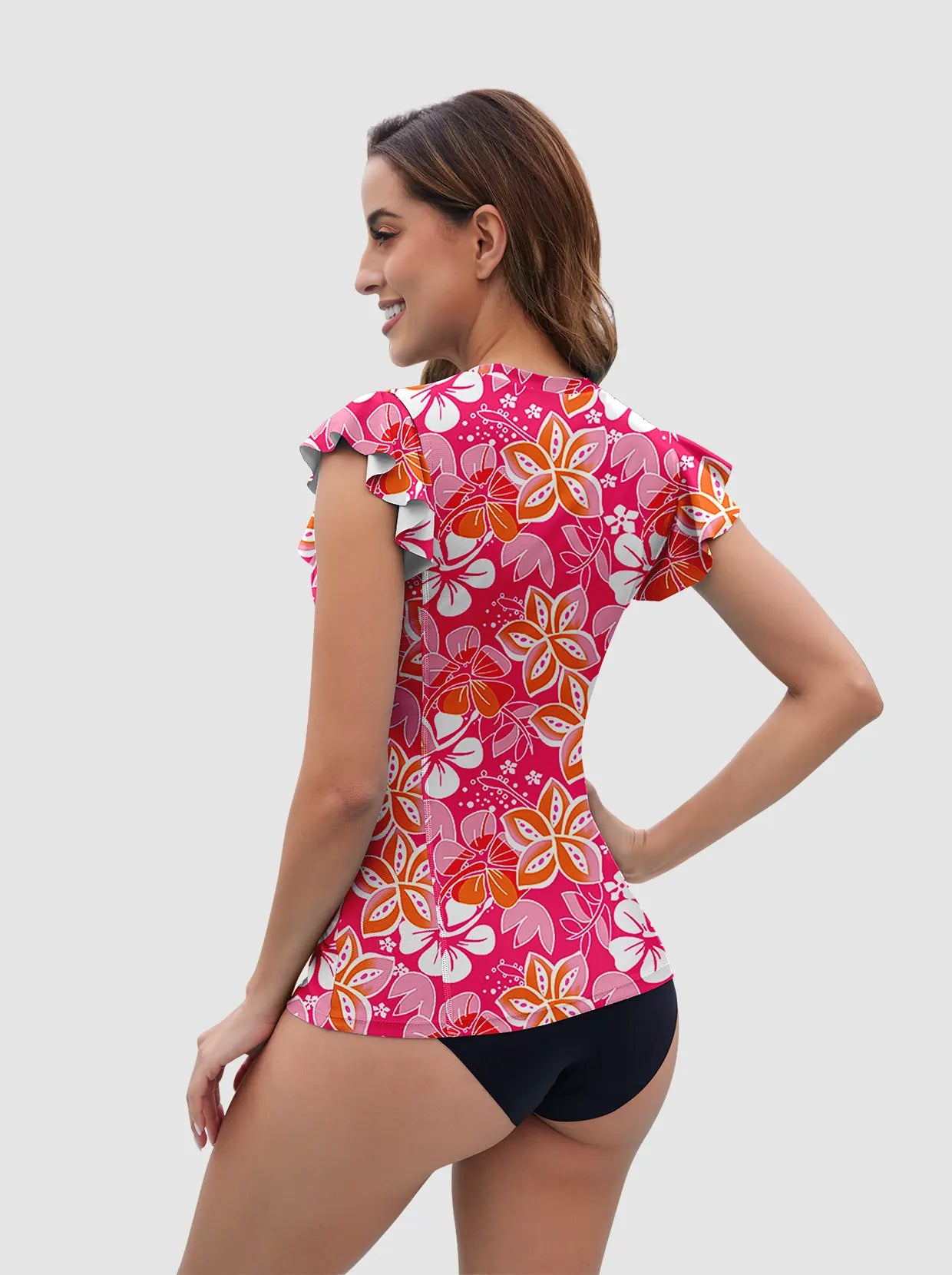Rose Red Floral Ruffled Sleeveless Rash Guard with Bulit-in Bra