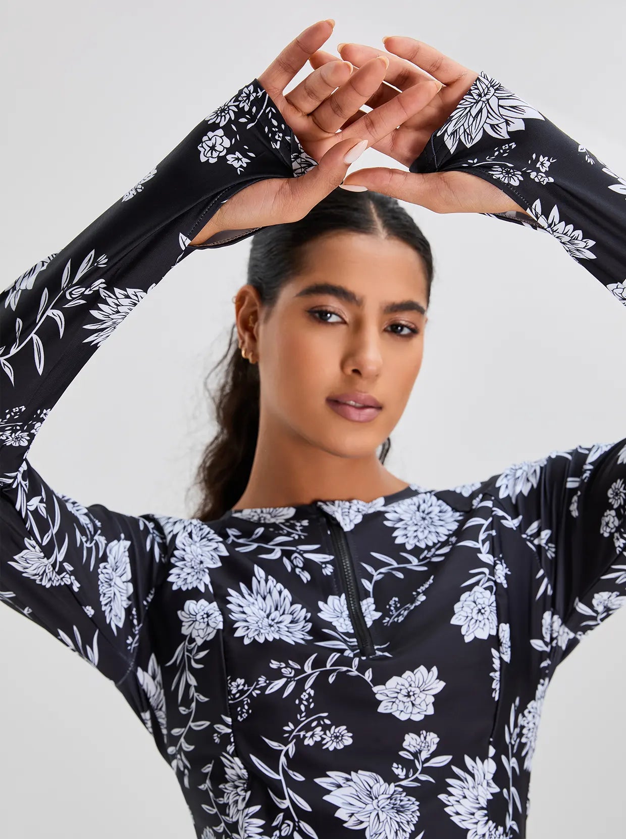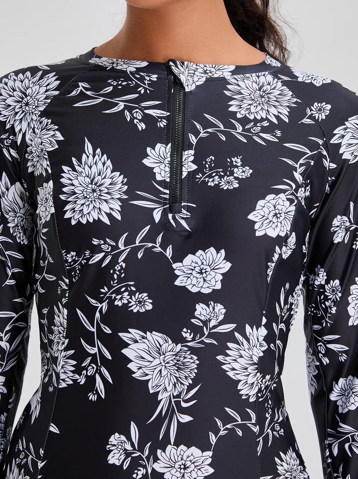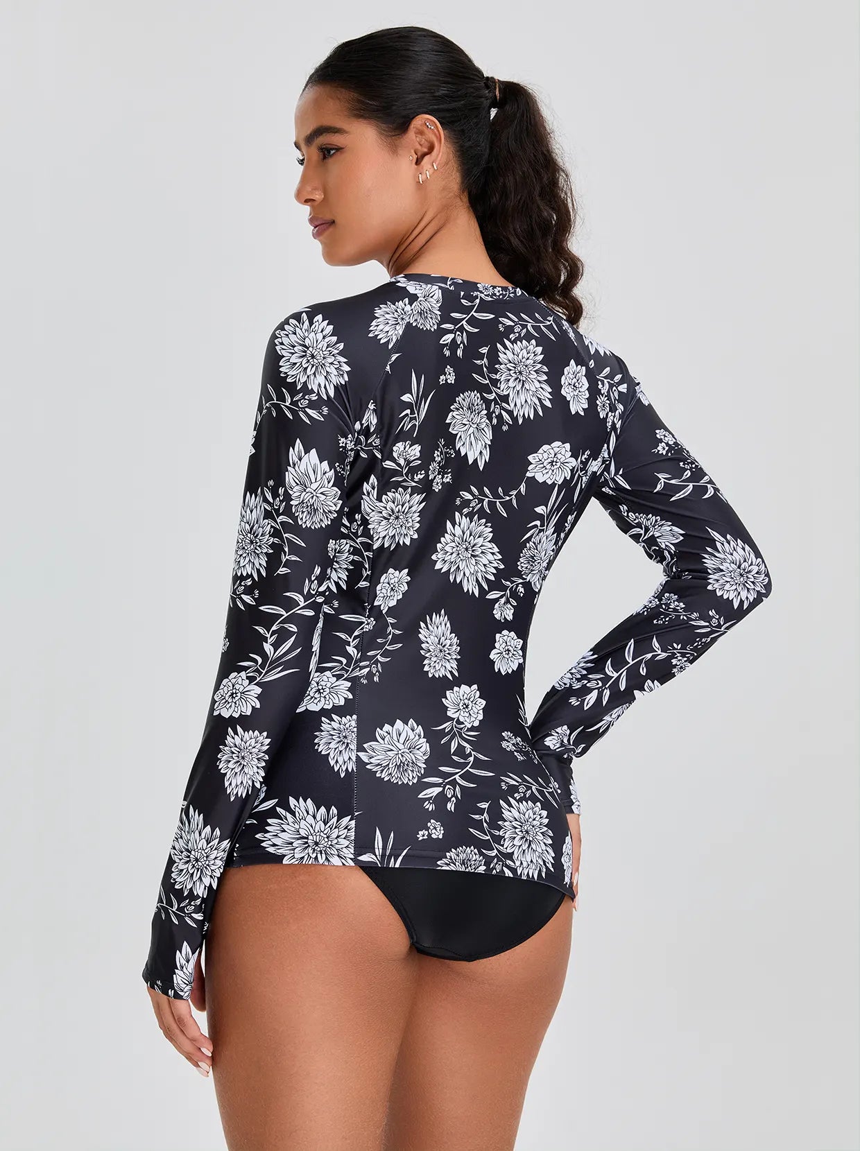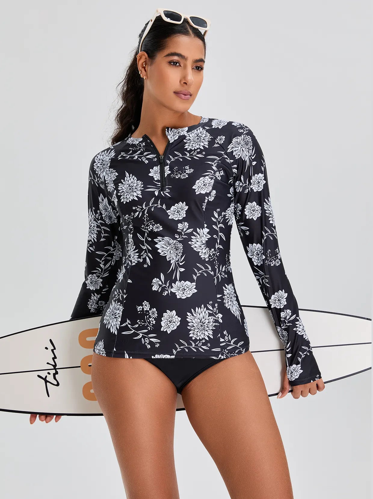 Our floral print long-sleeve rash guard is crafted from stretch, quick-dry, and breathable fabric, ensuring unrestricted movement and lasting comfort during your sports. UPF50+ sun protection (UVA/UVB) offers excellent defense against harmful rays, while the zipper flap, raglan sleeves, and thumbholes provide a snug, flexible feel for all your water adventures.