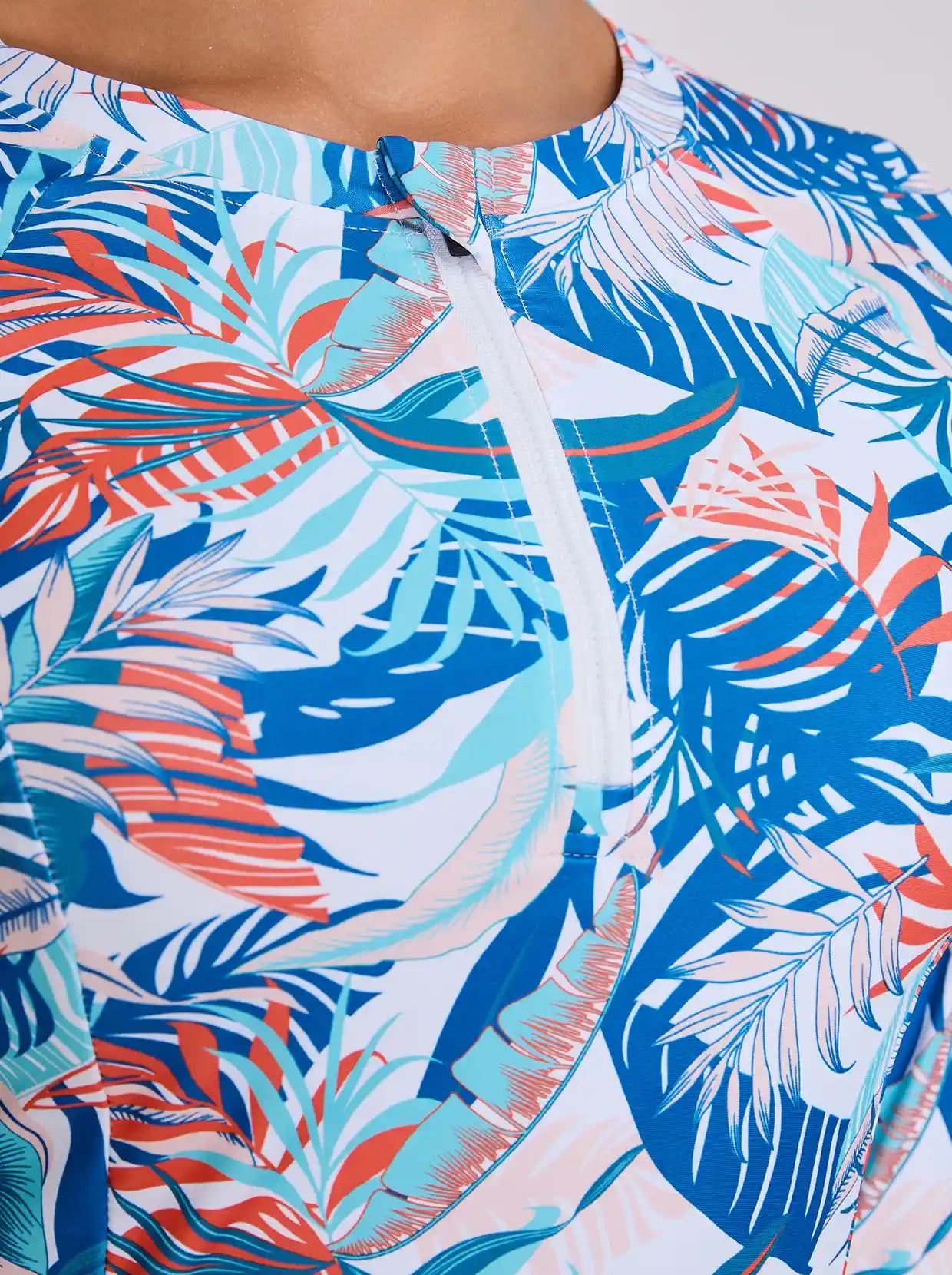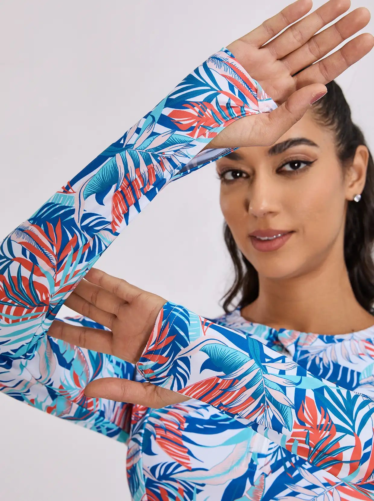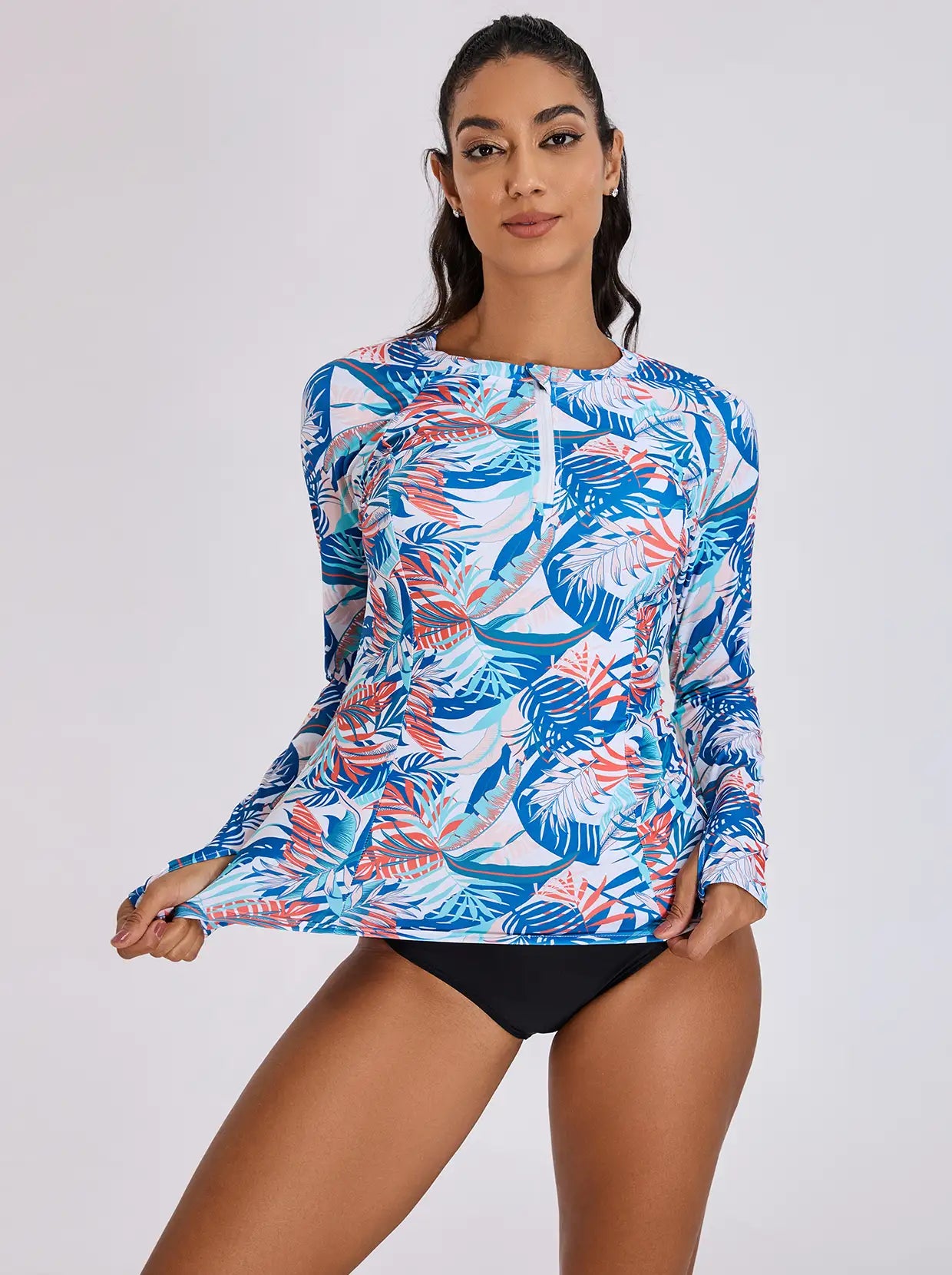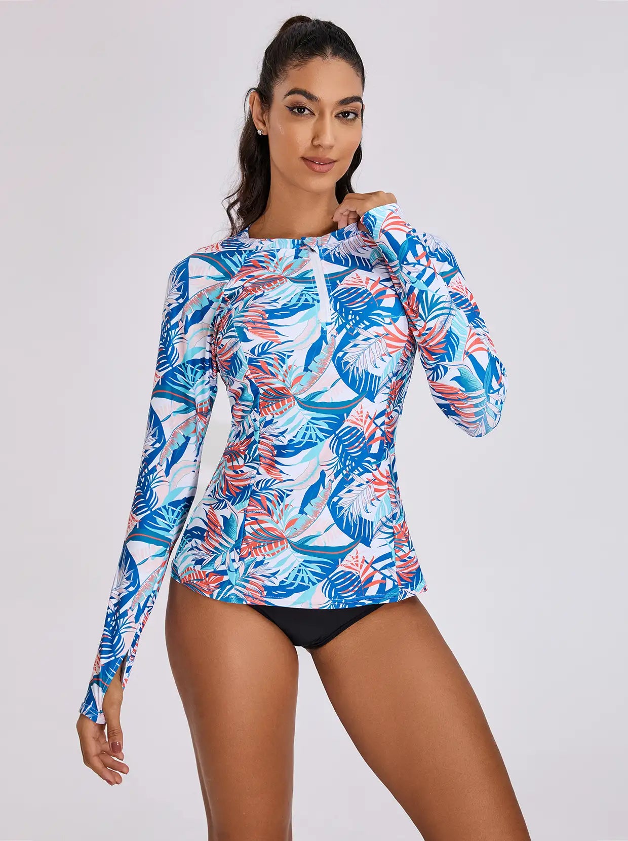 Blue and Green Leaves Quarter-zip Long-sleeve Rash Guard with Thumbhole