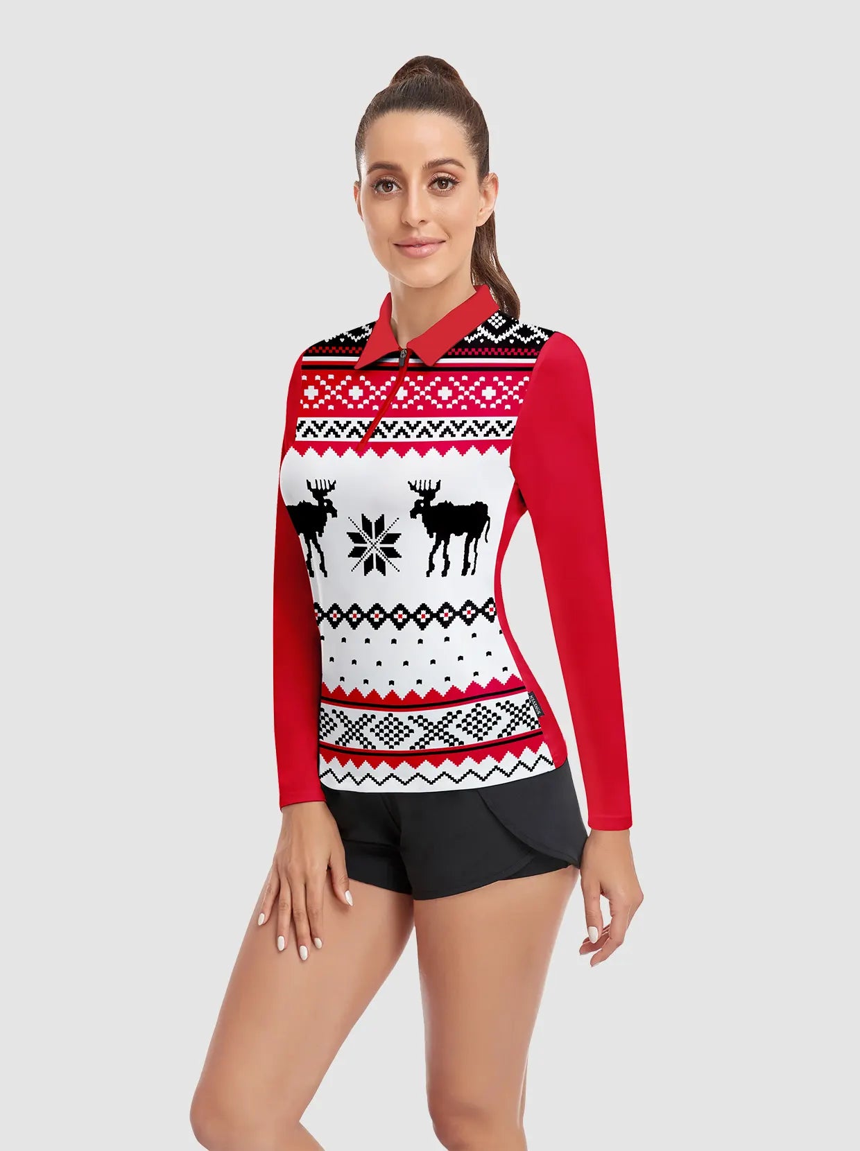 Christmas Reindeer Print Long-sleeve Polo Shirt for Ladies
