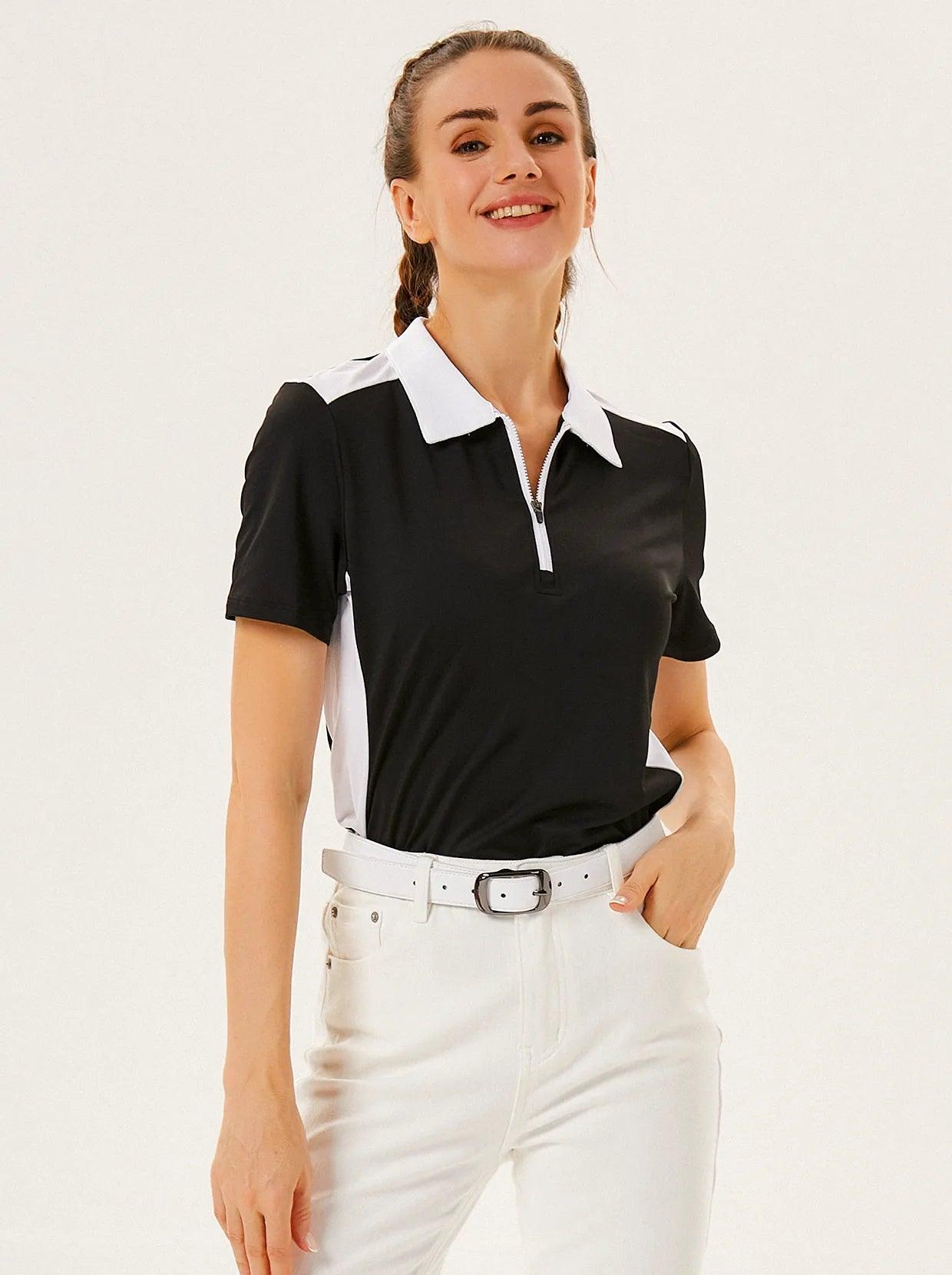 Shop our Ladies' Short Sleeve Golf Polo - Black Golf Polo Shirts Moisture Wicking Quick Dry Half-Zip Pullover Athletic Workout Striped Tops.