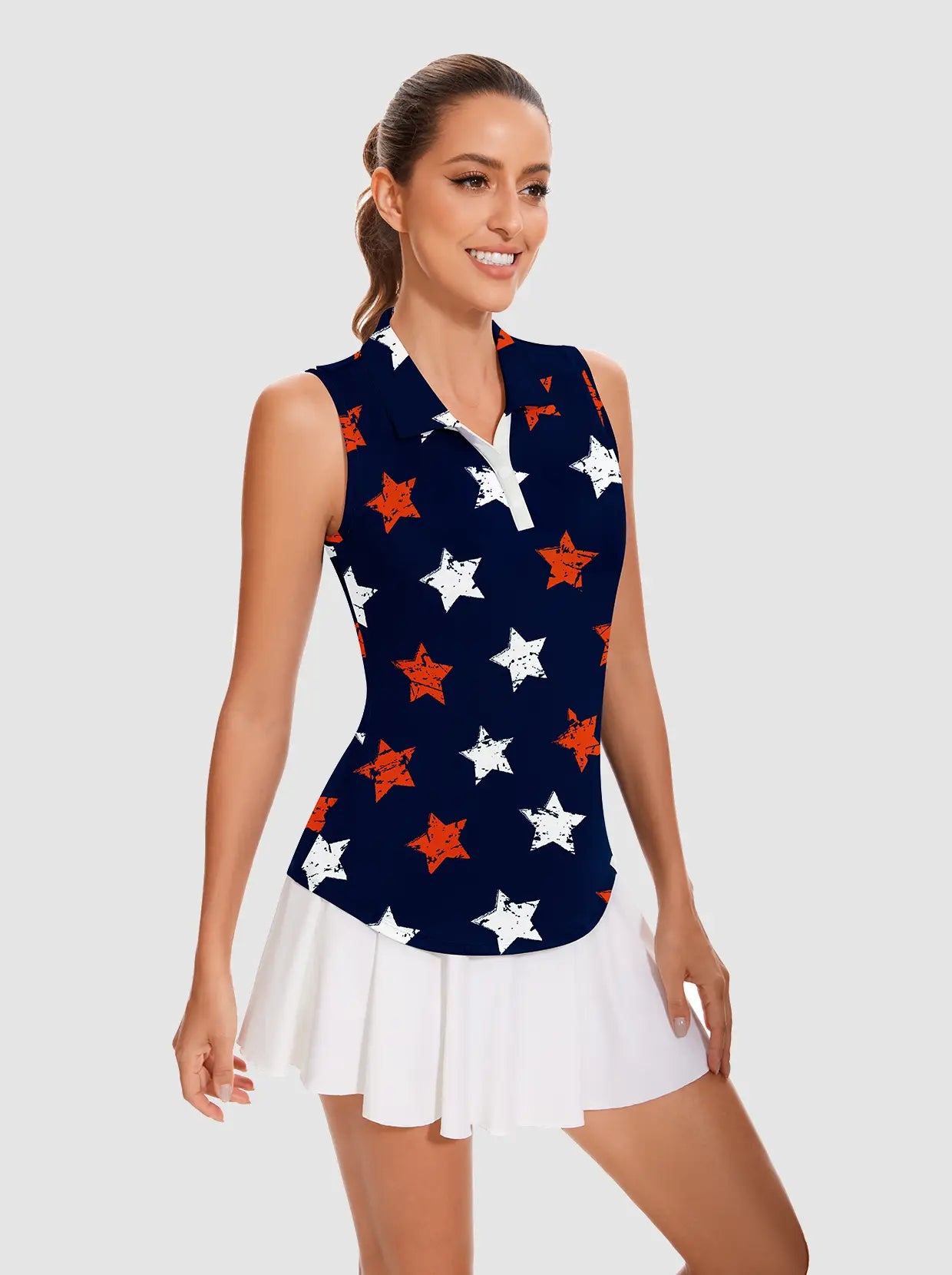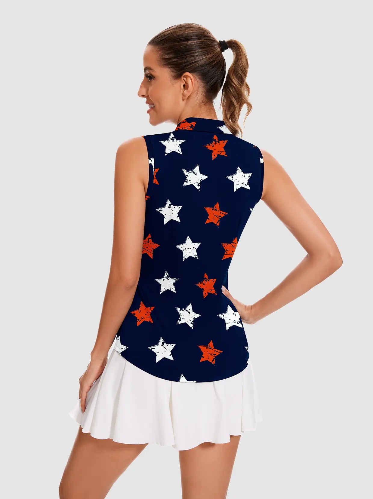 Effortlessly stylish and comfortable, this V-neck sleeveless polo shirt is perfect for your outdoor activities. Made with quick dry and breathable material, our sleeveless polo keeps you dry and cool. The 4-way stretch fabric allows maximum flexibility and movement, making it ideal for golf, tennis, pickleball, and any celebration. The eye-catching star print on a blue background adds a touch of playfulness to the classic design. Plus, with snap fasteners and a soft, curved hem, our polo top is convenient and flattering.