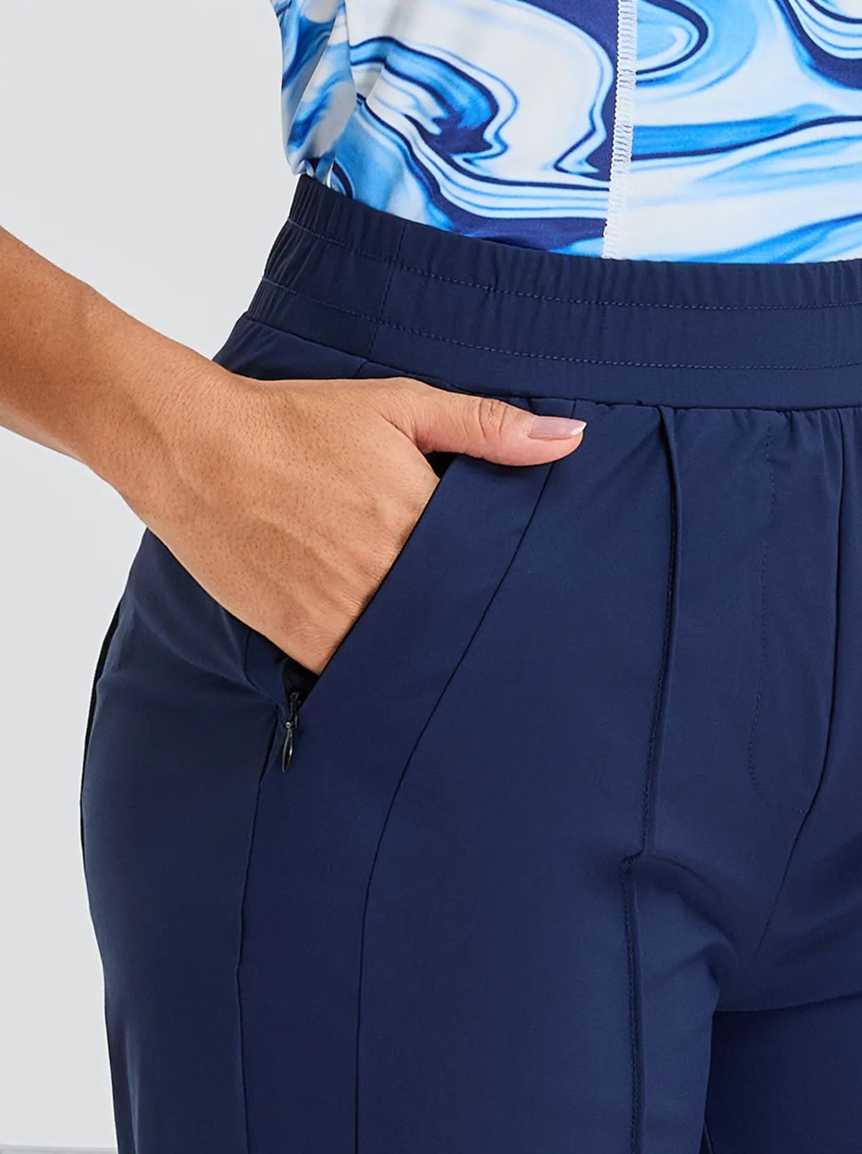 Move boldly in our golf navy shorts with 4-way stretch fabric for ultimate freedom. Secure your essentials in two back and two side zipper pockets. The center-pressed crease sharpens your look, while the elastic waistband ensures a perfect fit.