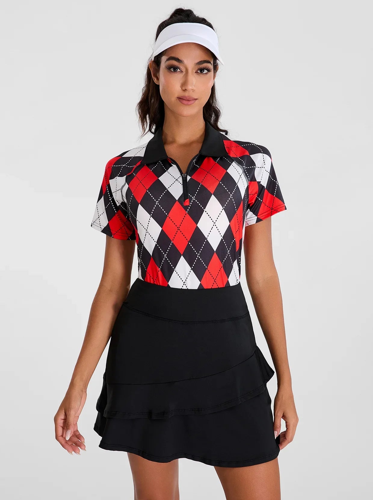 Swing your style with our checkerboard golf top! Crafted with breathable, moisture-wicking fabric, it keeps you feeling fresh and dry through every swing. Plus, its stretchy material and raglan sleeves ensure unrestricted movement, allowing you to focus solely on your game without any distractions!