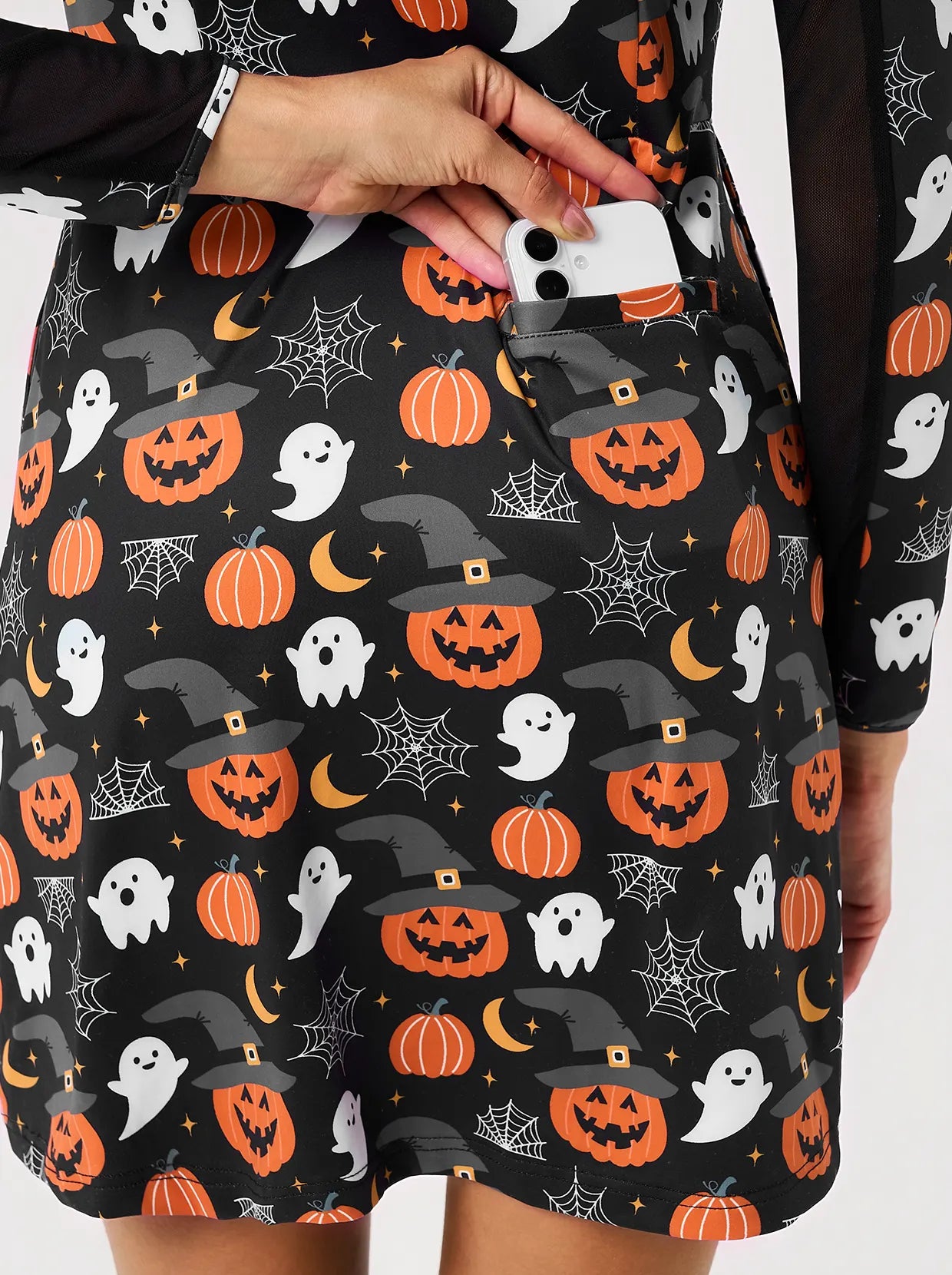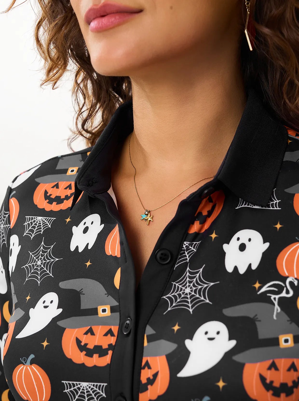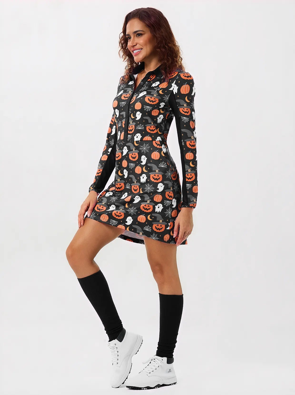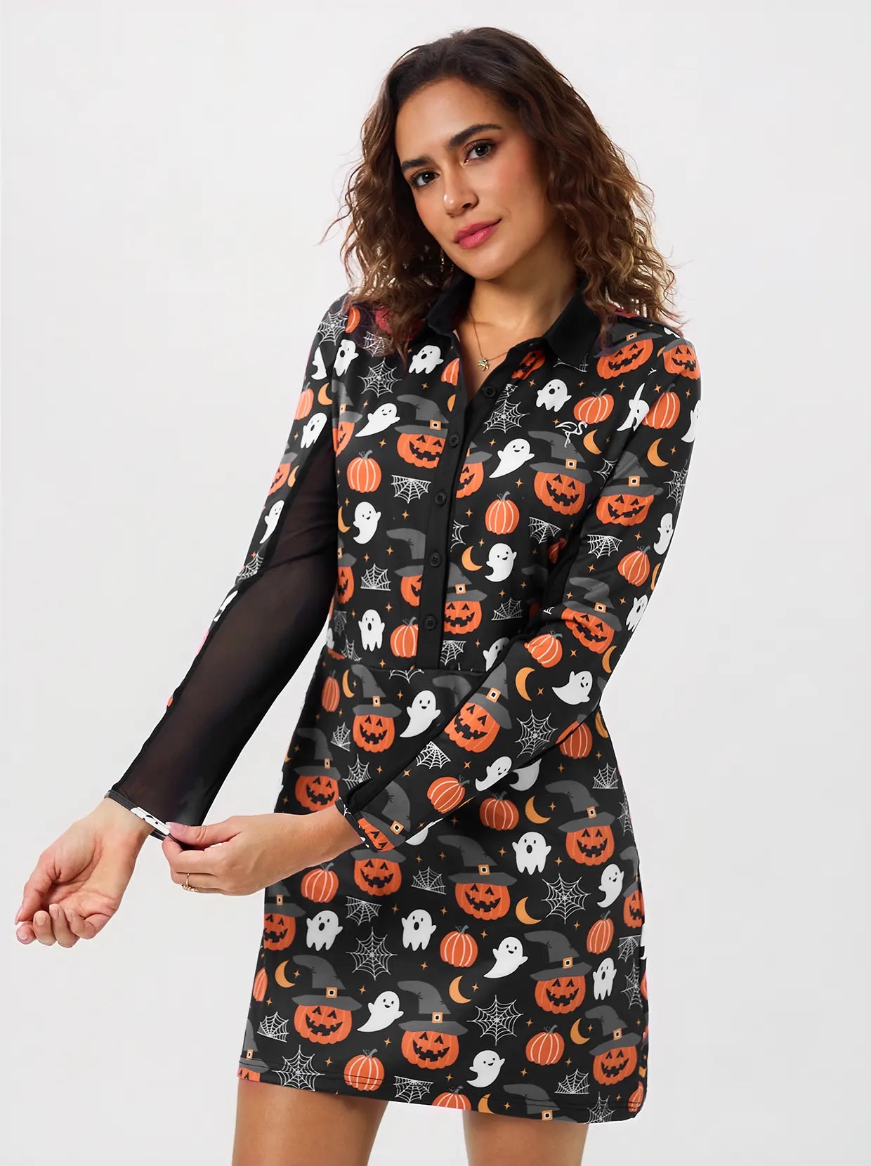 Feel the pumpkin perfection in our Halloween long-sleeve polo dress. The playful print adds a festive flair to your seasonal style, while the classic button placket offers a touch of timeless charm. Made from soft, breathable, and stretchy fabric, this dress is comfortable for all-day wear. Celebrate Halloween in comfort and style.