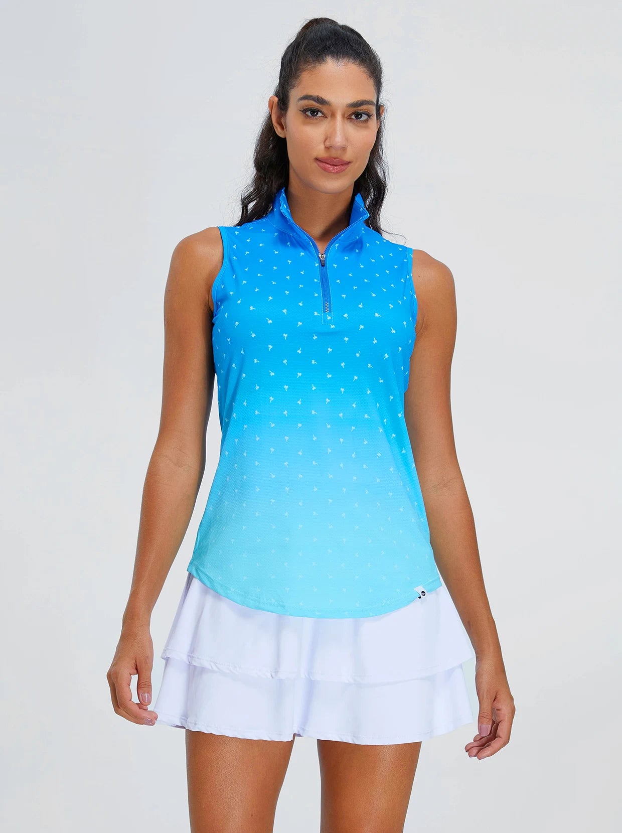 Bring a playful touch to your activewear collection with our quarter-zip polo shirt featuring a blue gradient pattern. This shirt is expertly crafted for both comfort and performance, thanks to its 4-way stretch and moisture-wicking fabric that keeps you cool and dry. The soft and breathable material ensures all-day comfort, making it ideal for sports, as well as for everyday wear. No matter what your day holds, you'll look and feel fantastic!