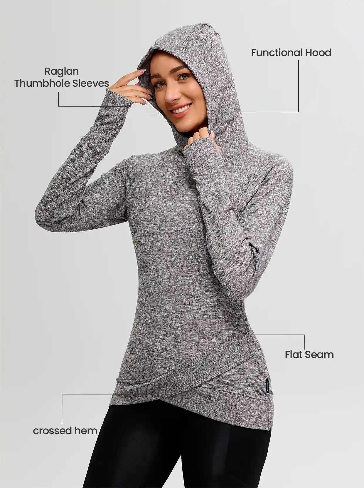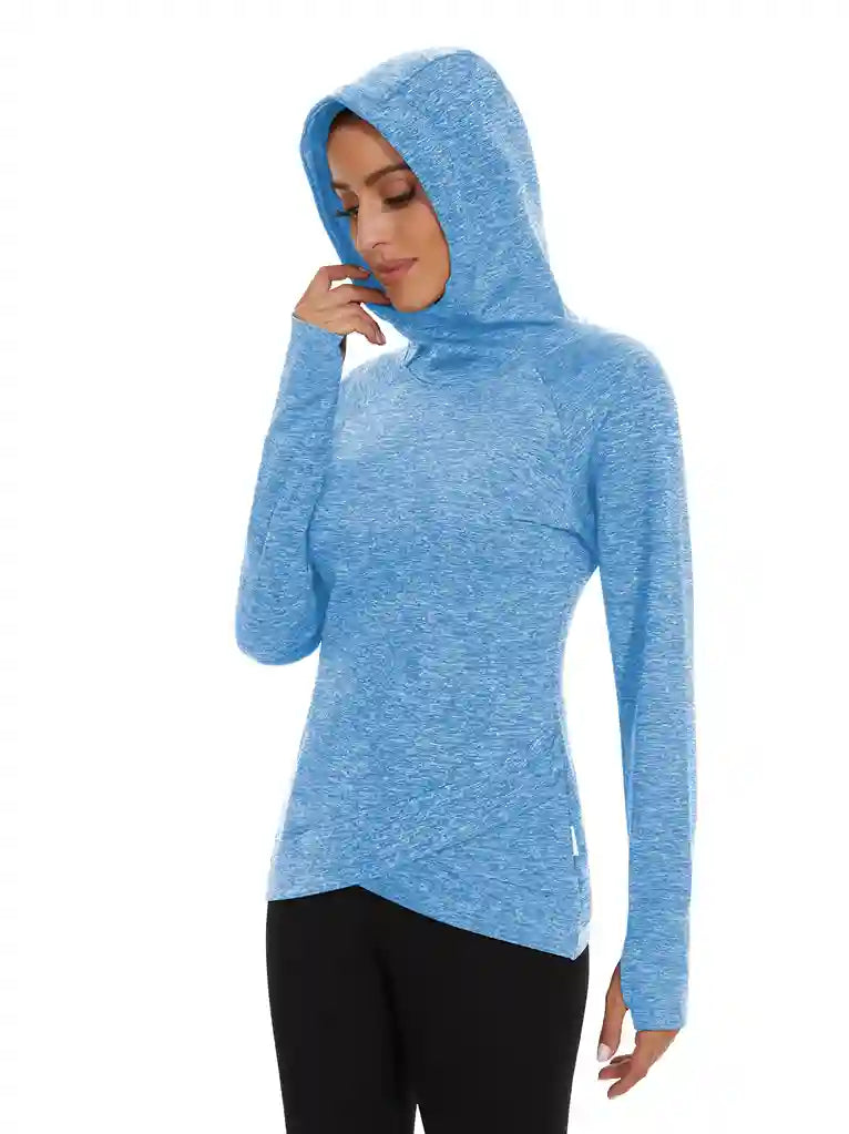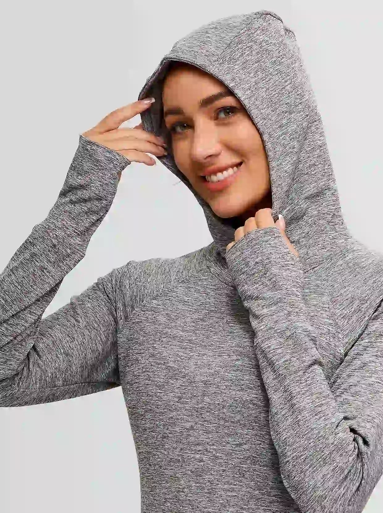 Highlights: UPF50+ (UVA/UVB), active fit, hoodies, crossed hem, thumbholes