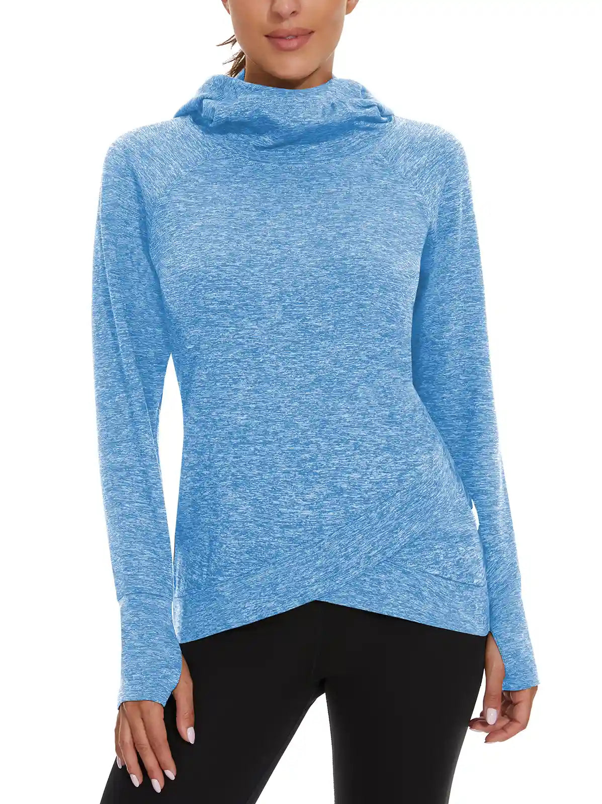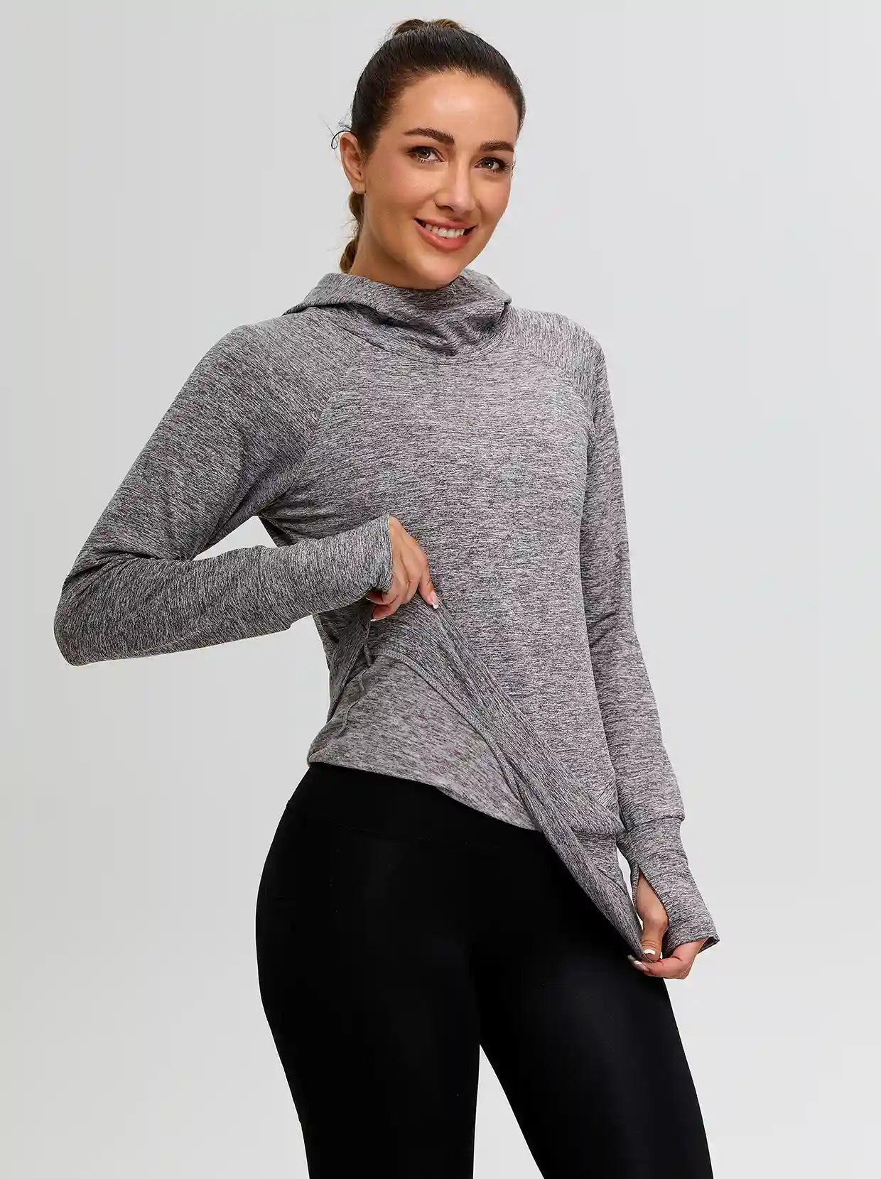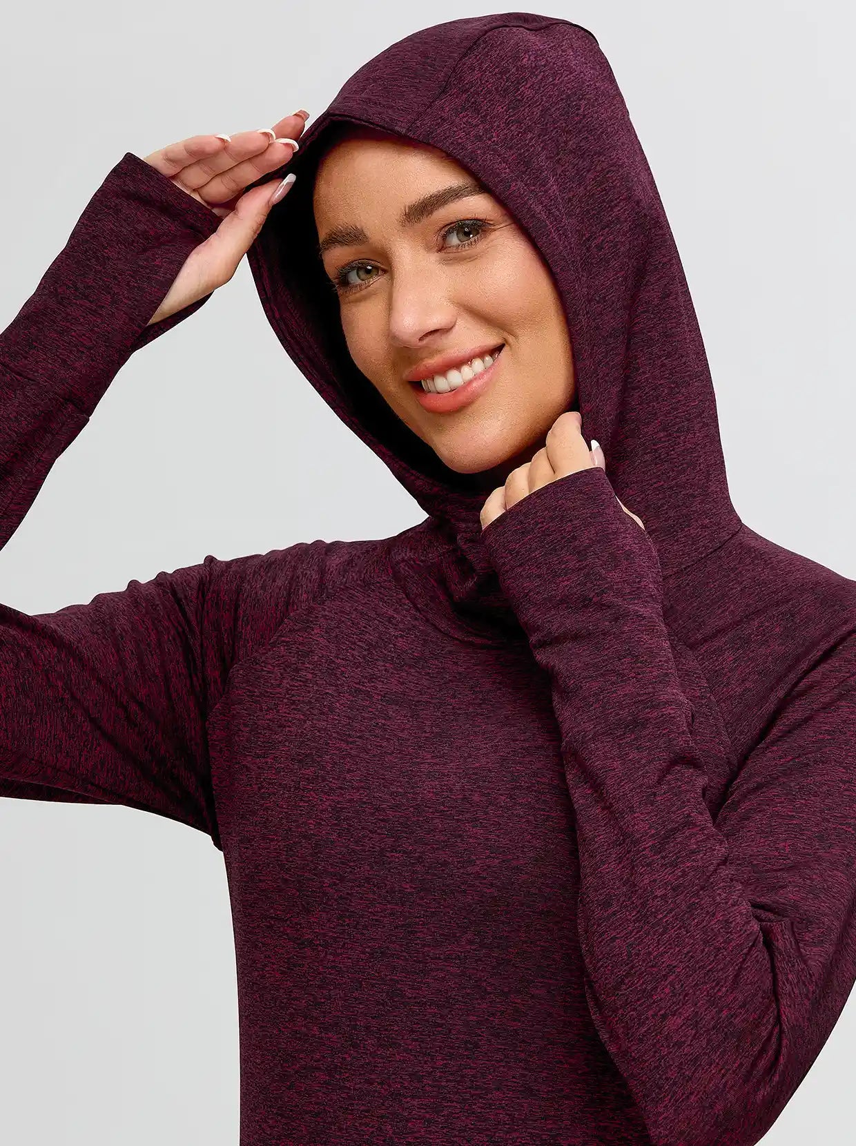 Highlights: UPF50+ (UVA/UVB), active fit, hoodies, crossed hem, thumbholes