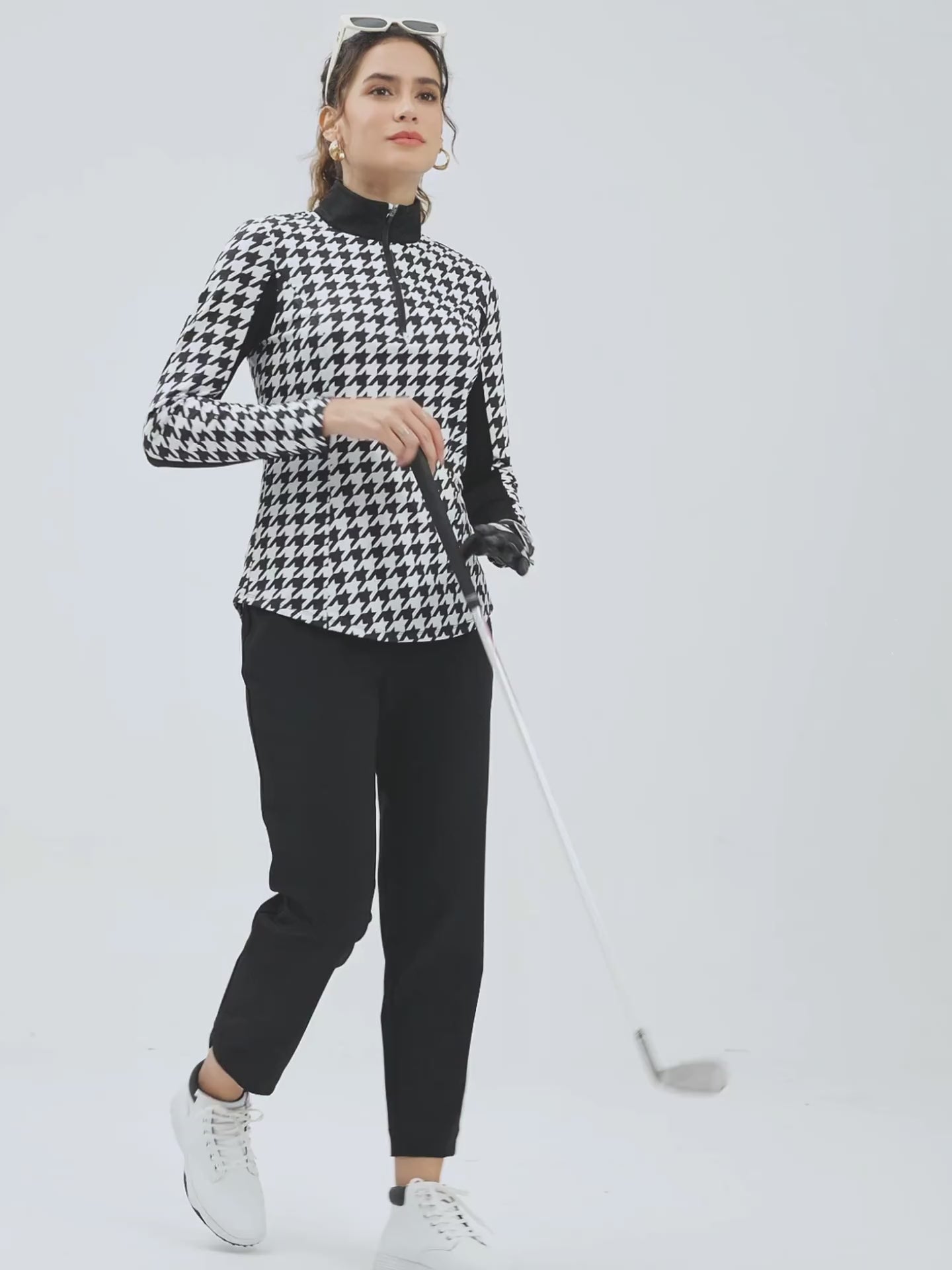 Rock the classic houndstooth pattern in our long-sleeve golf polo shirt. Crafted from a moisture-wicking, 4-way stretch fabric, you can move effortlessly through every swing and stride. The half-mesh sleeves offer a perfect balance of breathability and sun protection. The curved hem and polished quarter-zip collar deliver a flattering, streamlined fit.
