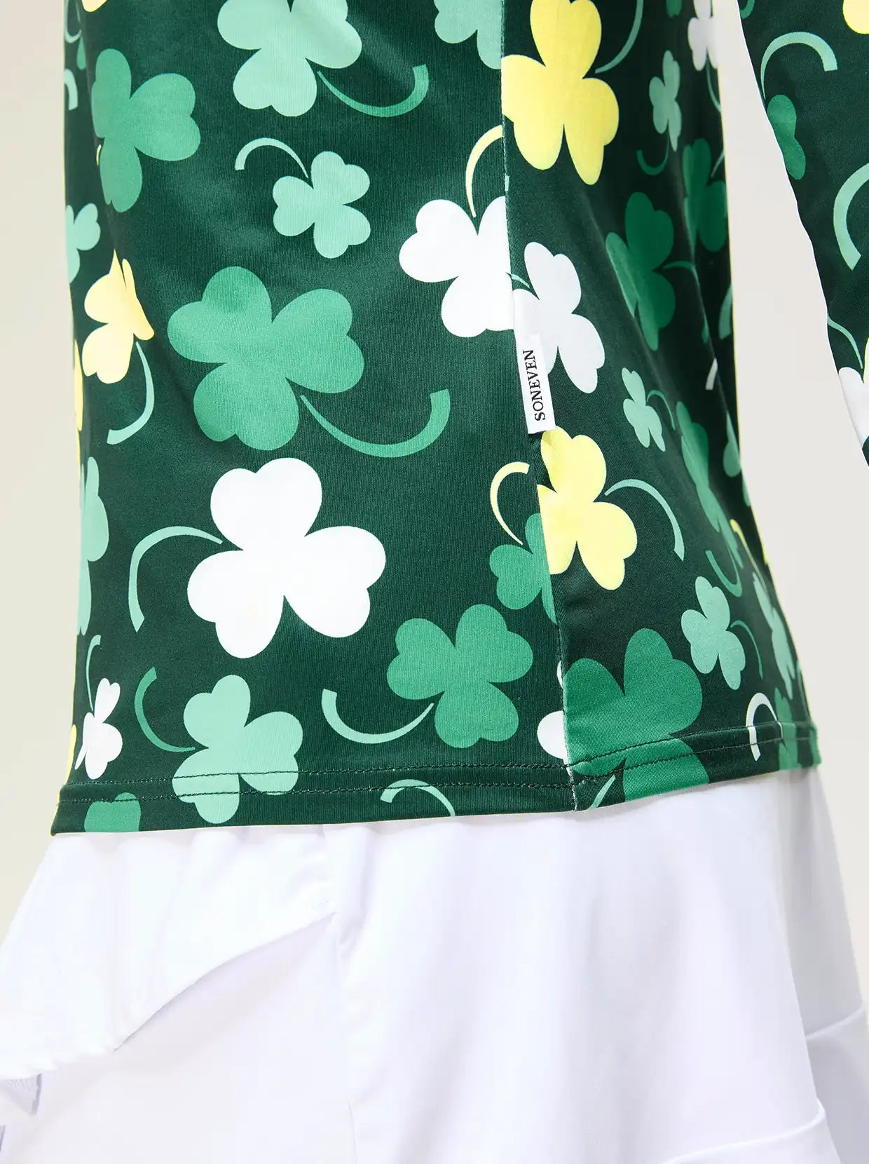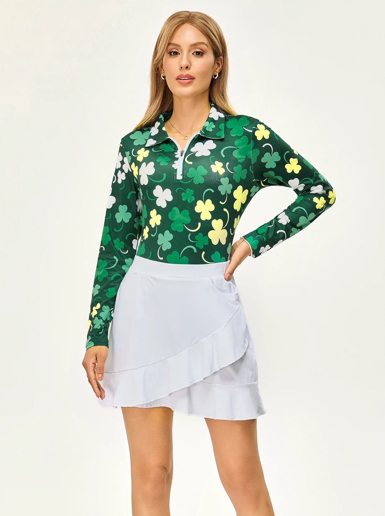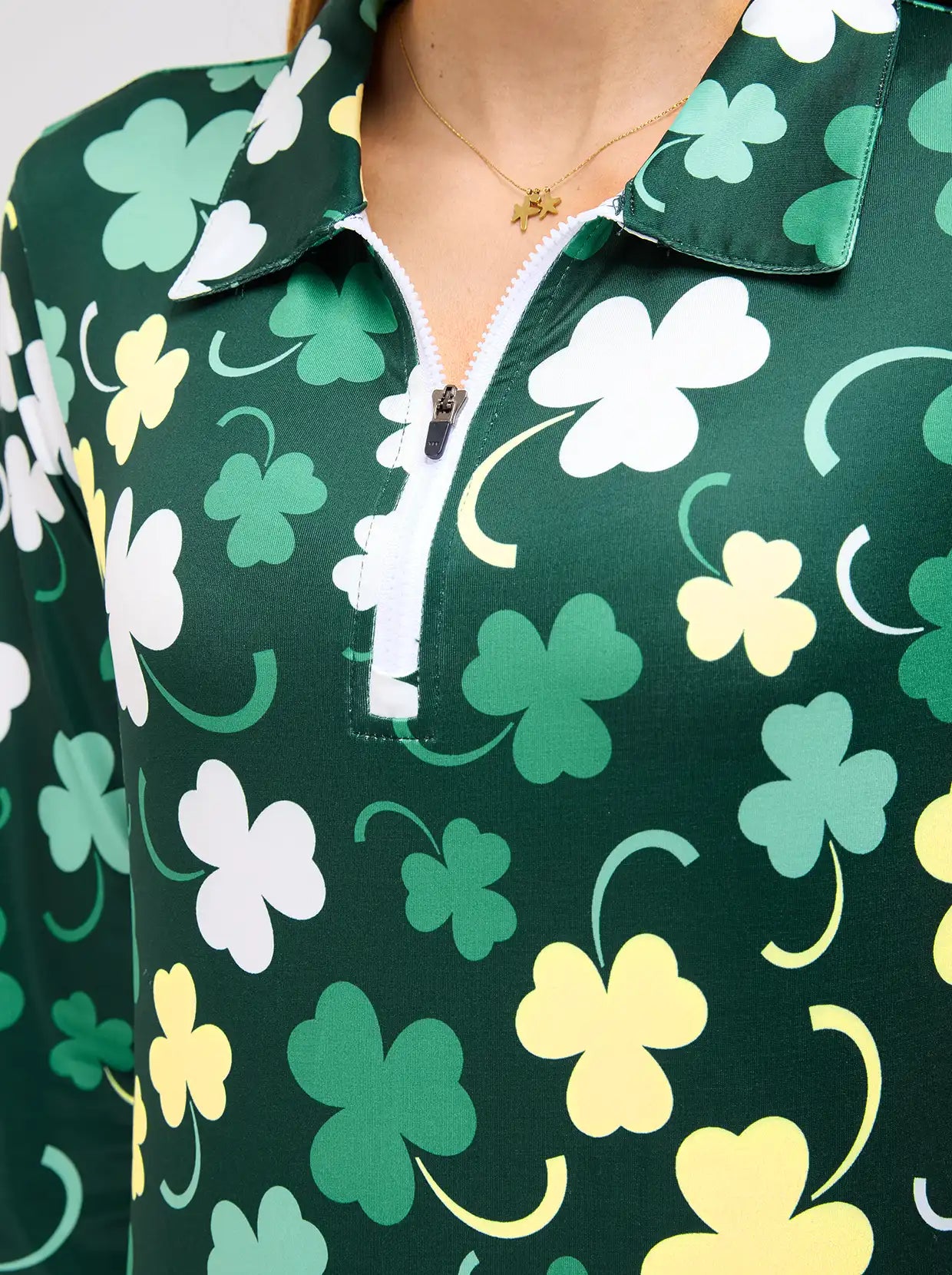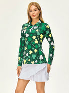 Get into the holiday spirit with our Green Shamrock Quarter-zip Long-sleeve Polo Shirt. Made with breathable, moisture-wicking material, it's the perfect choice for St. Patrick's Day or everyday wear. Its 4-way stretch and lightweight design make it versatile for any casual occasion, and the stylish collar and quarter-zip add a practical and trendy touch. Stay comfortable all day long with this must-have shirt.