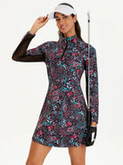 Bye-bye, sweaty arms! Elevate your game and style with our Black Paisley Quarter-Zip Long-Sleeve Dress! This stunning dress features a vibrant, eye-catching paisley print set against a sleek black backdrop. Crafted from soft, 4-way stretch fabric, it offers ultimate comfort and freedom of movement. Designed with half-breathable mesh sleeves, pockets, and built-in shorts, plus a stand collar with a quarter-zip.