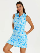 35" Blue Water Ripples Stand-collar Sleeveless Dress with Pockets
