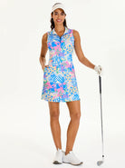Unleash your inner nature with this tropical leopard print dress from our Call of the Wild Collection. This women's golf dress features a chic stand collar and a functional sleeveless design, blending fierce style with practical comfort. Discover more sleeveless dresses with pockets in our collection.