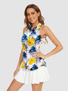 Experience comfort and style with our Blue and Yellow Floral Racerback Sleeveless Polo Shirt. The thoughtfully designed racerback with curved hem offers freedom of movement while the 4-way stretch fabric keeps you comfortable all day. Moisture-wicking and breathable material make it perfect for golf, tennis, pickleball, or casual outings. The sleeveless design with button-down collar combines functionality with elegance in beautiful blue and yellow floral patterns.