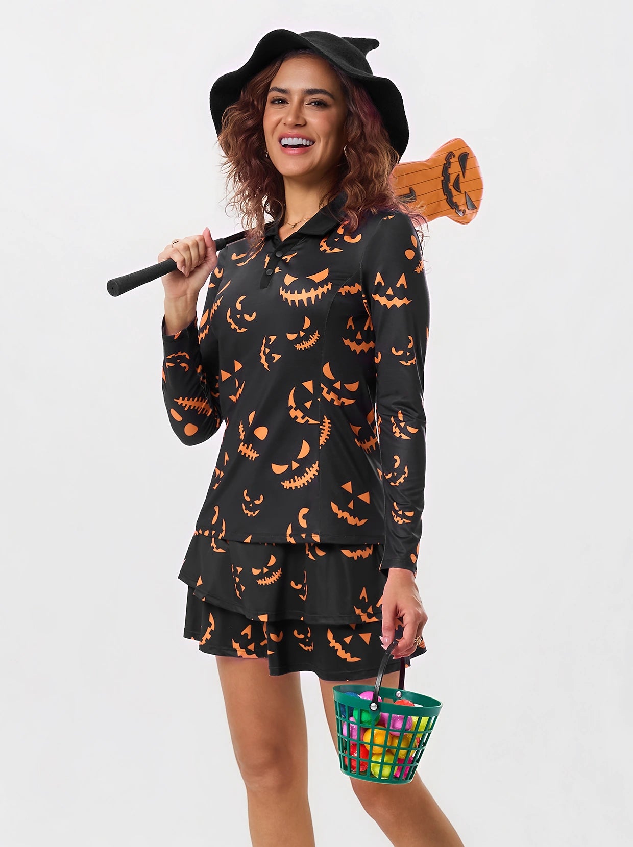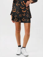 Tee off for a spooky season in this versatile skort. The 4-way stretch fabric feels amazing, offering free movement for all Halloween parties. Built-in shorts and a hidden pocket keep essentials secure, while the smooth waistband and breathable material make it perfect for all-day wear. Featuring a playful Pumpkin Grin Print, this skort is perfect for all your Halloween activities in comfort and style.