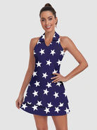 Stay cool and comfortable in this White Star racerback dress, featuring double layers and pockets for convenience. Made with moisture-wicking and four-way stretch material, this dress is perfect for activities like golf, tennis, pickleball, or simply casual wear. You'll love the V-neck and sleeveless design, and the star pattern adds a touch of style. Available in sizes S-XXL, ranging from 32-35 inches in length.