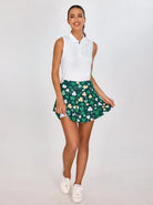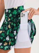 Make a statement this St. Patrick's Day with our Green Clover 17" Double Layer Active Skort for Women. Keep your essentials within reach with the inner shorts pocket and enjoy optimal comfort thanks to the built-in shorts and flat-wide waistband. Perfect for any active occasion, this skort comes in a fun green, yellow, and white clover print that will make you stand out in style.