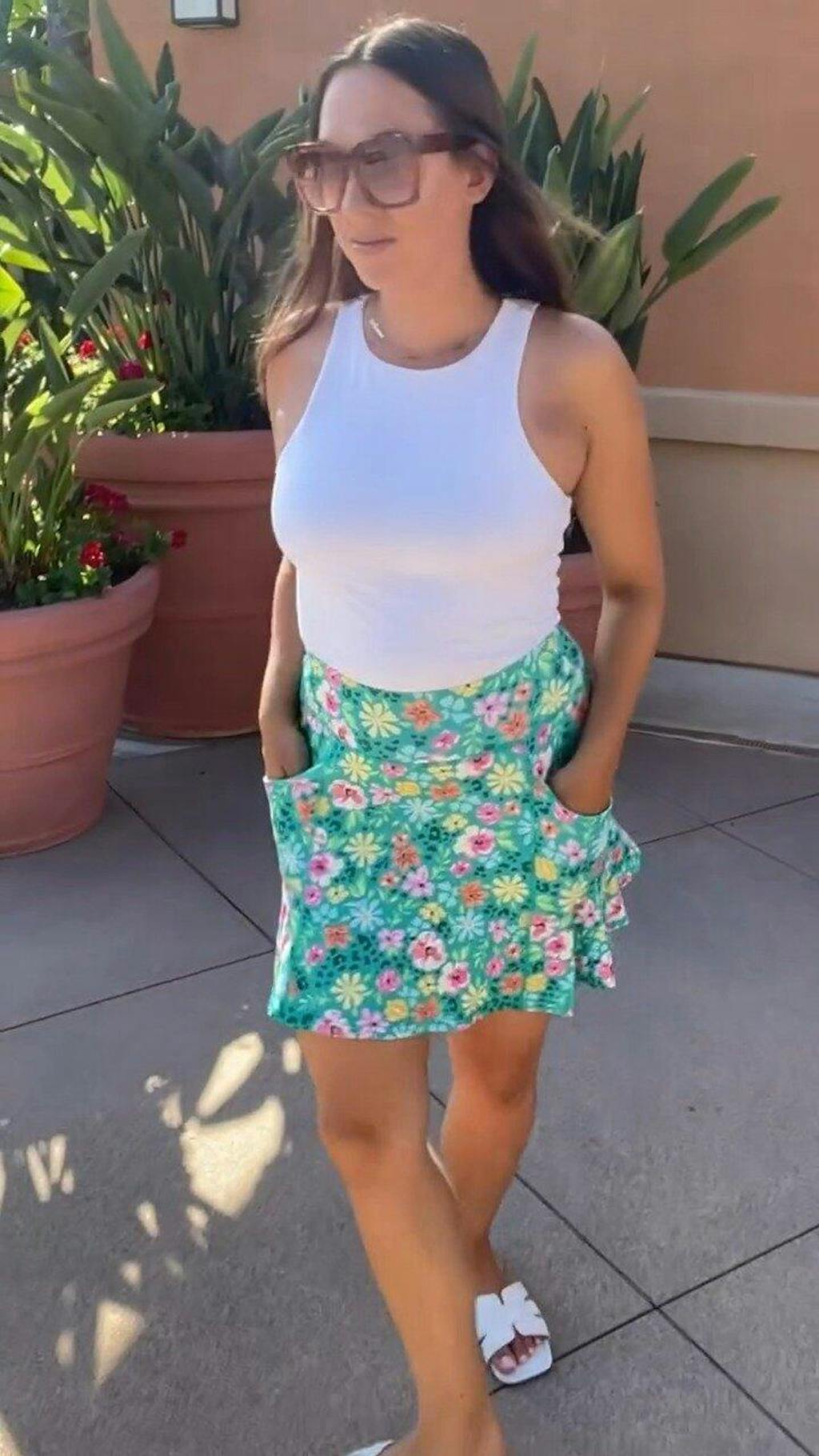 17" Green Floral Pleated Skorts with Shorts and Pockets