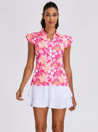 Unleash your adventurous spirit with our Flower Print V-neck Ruffled Sleeveless Polo Shirt! Designed with ruffled sleeves and a V-neck collar, this polo shirt adds a touch of boldness to your athletic look. Made from a breathable, soft, moisture-wicking material that keeps you cool and comfortable. Plus, with its 4-way stretch, this shirt moves with you for maximum mobility. Whether you're hitting the golf course, tennis court, or pickleball court, our shirt will help you take on any challenge.