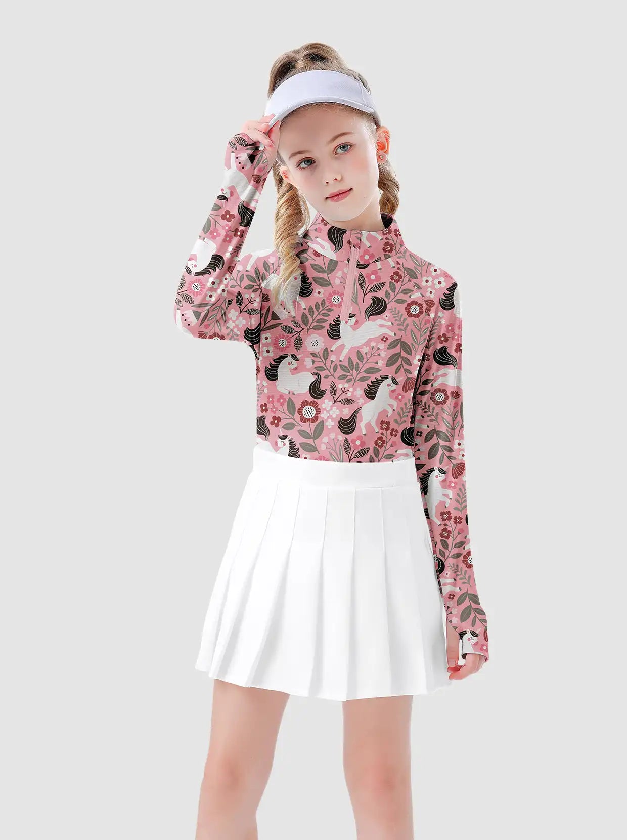 Embrace the magic of playtime with our Girls Unicorn Pattern Quarter-zip Long-Sleeve Shirt. Not only does it feature a delightful white unicorn print running on a playful pink background, but it also offers sun protection and thumbholes to keep your little one safe from the sun's harmful rays. Plus, with features like an active fit, moisture-wicking fabric, and 4-way stretch, our long-sleeve shirt is perfect for outdoor activities and daily wear. And don't forget the convenient quarter-zip and raglan sleeves for added comfort. It's a must-have for every adventurous little girl, ages 6-14.