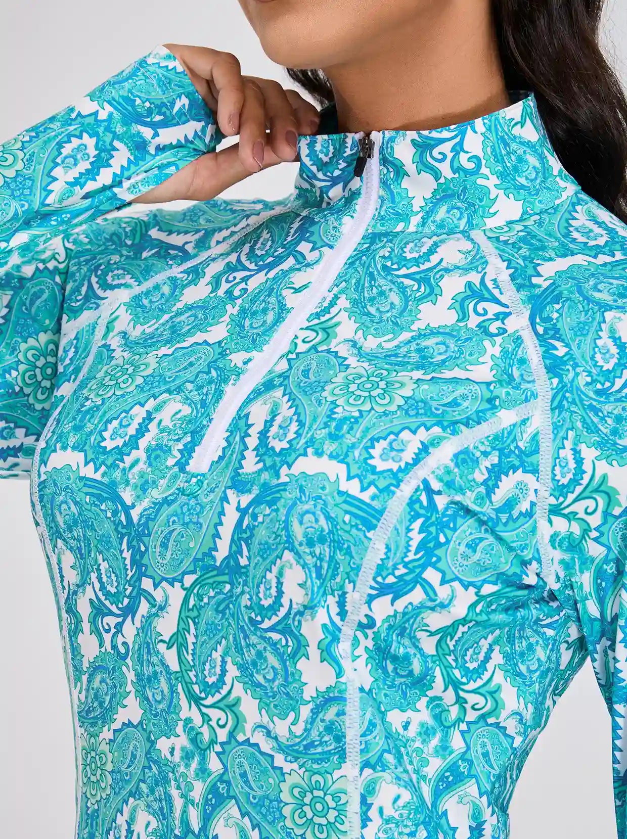 Elevate your style with our Women's Green Paisley Quarter-Zip Long-Sleeve Shirt. Crafted from a lightweight, 4-way stretch fabric, it offers maximum comfort and movement. The moisture-wicking and quick-dry material keeps you dry, while the thumbholes and zipper pockets provide added convenience. The back fold line accentuates your curves, making it the perfect blend of style and function.