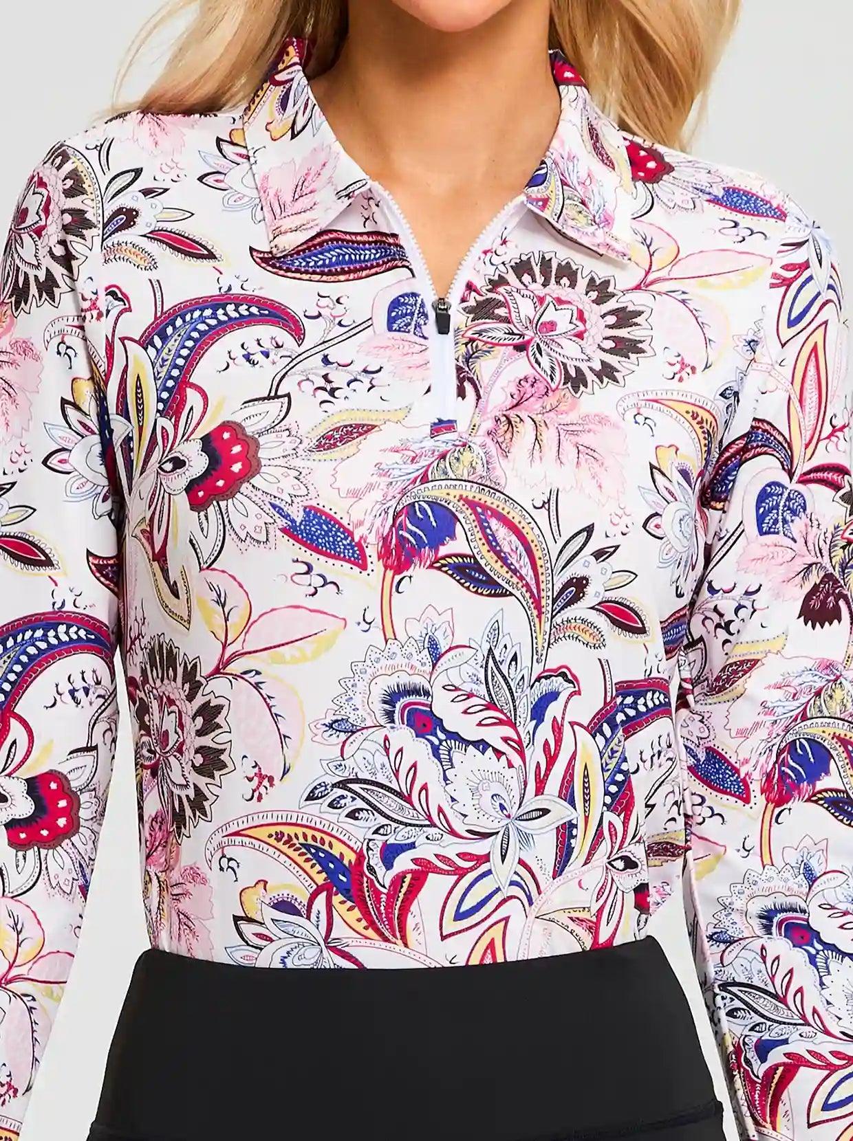 Stand out on the court with these womens long sleeve polo tops featuring a fun paisley pattern. The stretch material provides a comfortable and flexible fit. The UPF50+ rating ensures you're protected from harmful UVA/UVB rays, making it perfect for outdoor activities. And, the streamlined cut and quarter-zip neckline of these womens golf shirts make them stylish and functional, while the long sleeves provide coverage in cooler weather. Perfect for all your athletic needs.