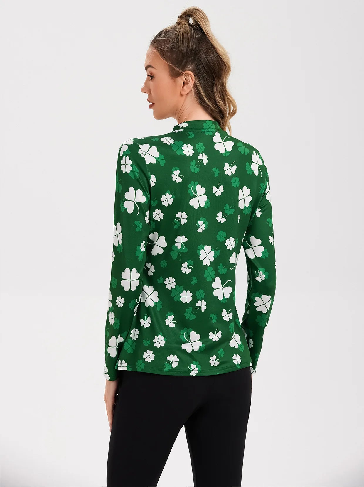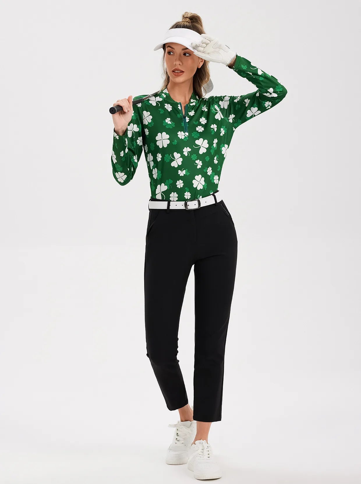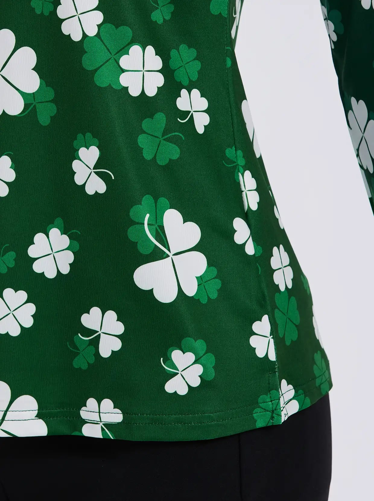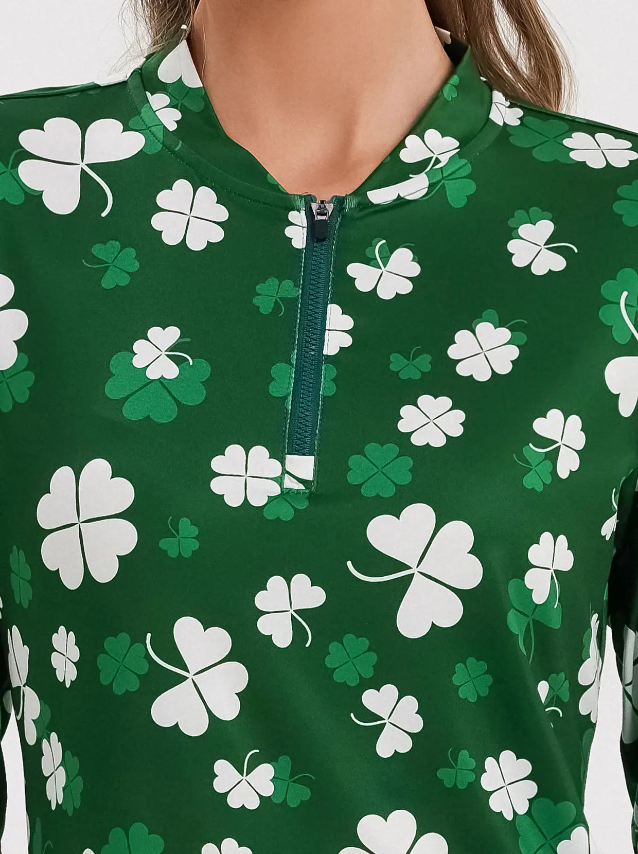 Get ready to put a little spring in your step on the green! Our Quarter-Zip Long-Sleeve Shirt keeps you safe from UVA/UVB with UPF50+, while the stretch and breathable fabric keeps you cool and dry. Its playful green and white clover print adds a touch of charm to your athletic wardrobe.