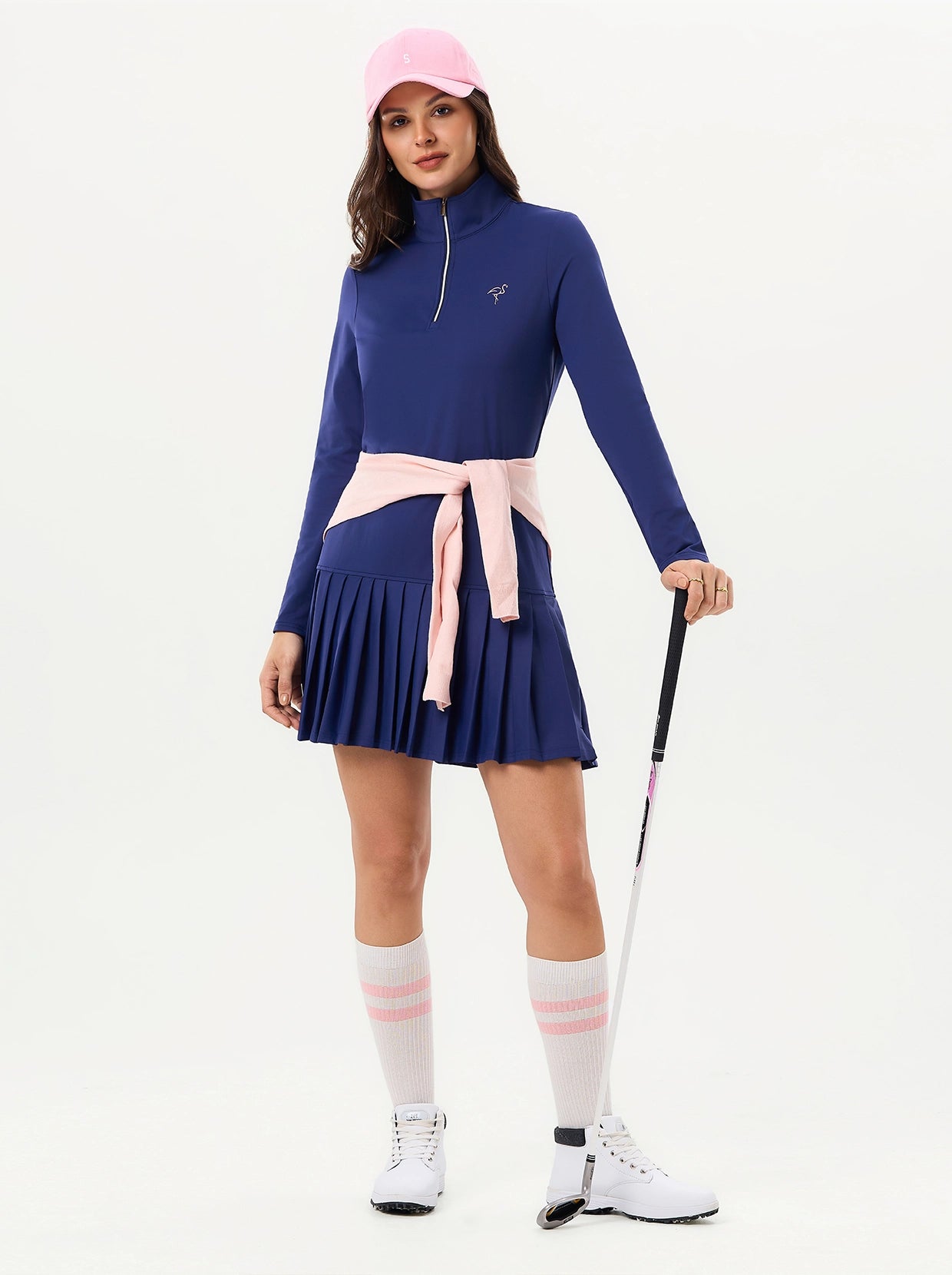 Navy 35" Quarter-zip Long-sleeve Pleated Dress with Shorts