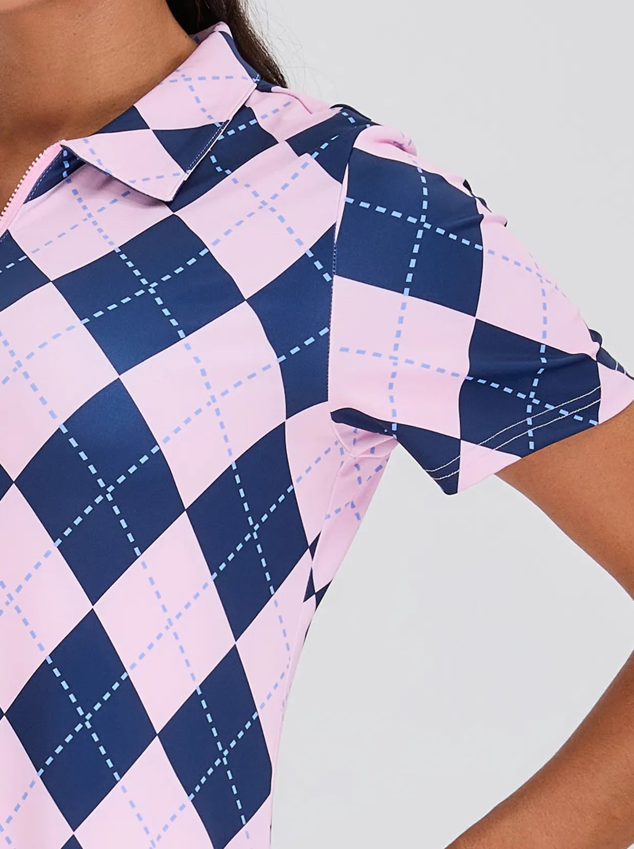 33" Pink and Navy Checkerboard Zipper Short-Sleeve Polo Dress with Shorts