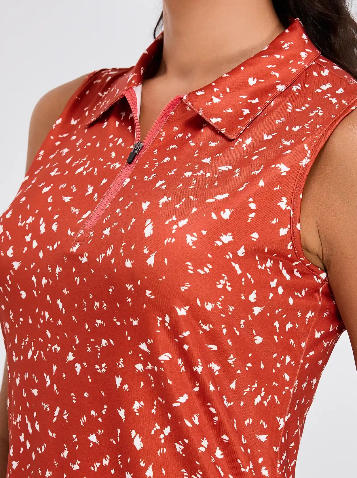 Complement your active lifestyle with our versatile and comfortable polo shirt. Made with a soft, breathable, moisture-wicking material that offers 4-way stretch for a full range of motion, it's perfect for sports like golf, tennis, and pickleball, as well as everyday activities. The eye-catching dot pattern adds a touch of style to this classic white and red color combination. And with its sleeveless design and quarter-zip collar, you'll stay cool and comfortable no matter the activity. Order now and elevate your wardrobe with this must-have piece.